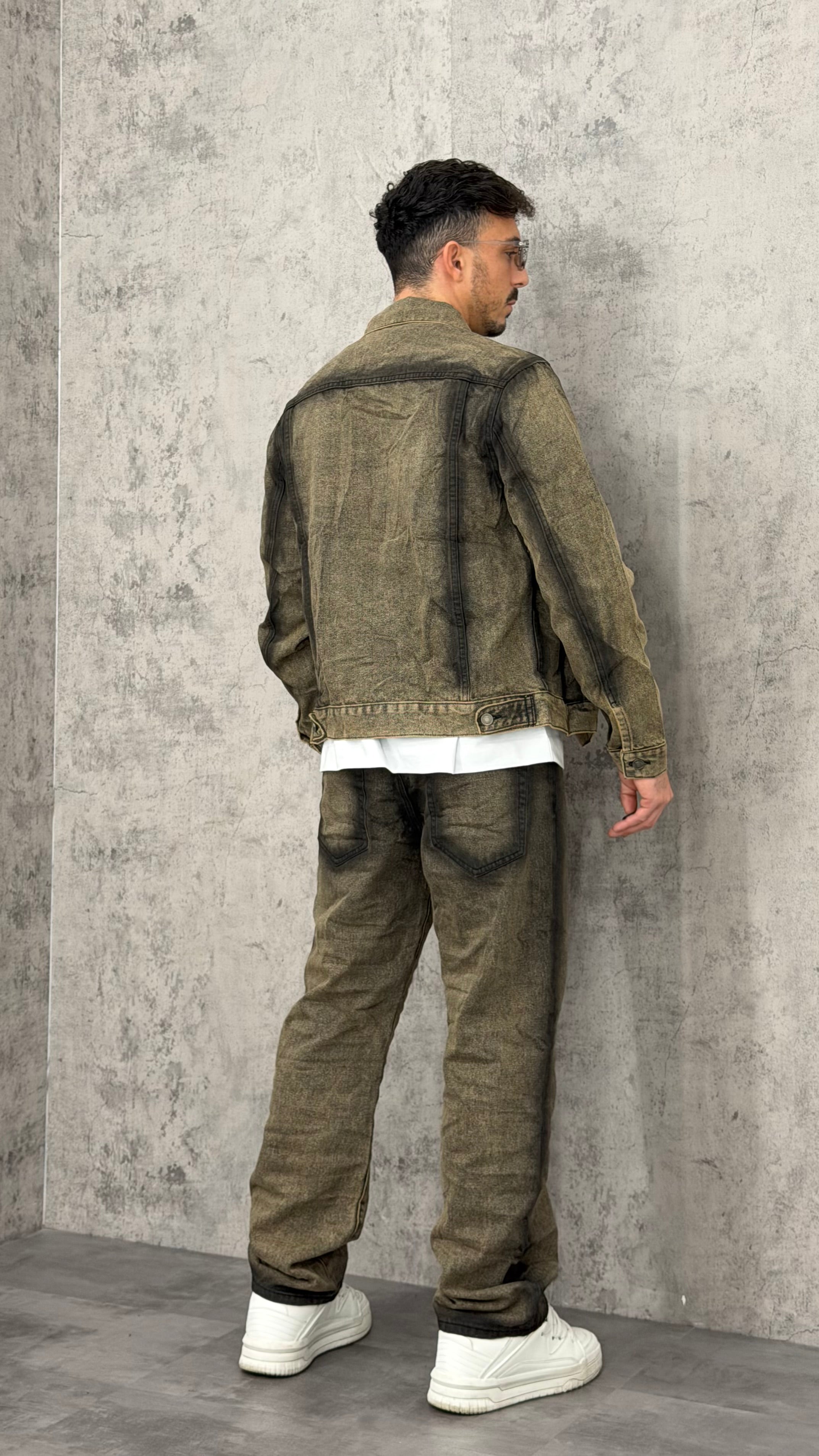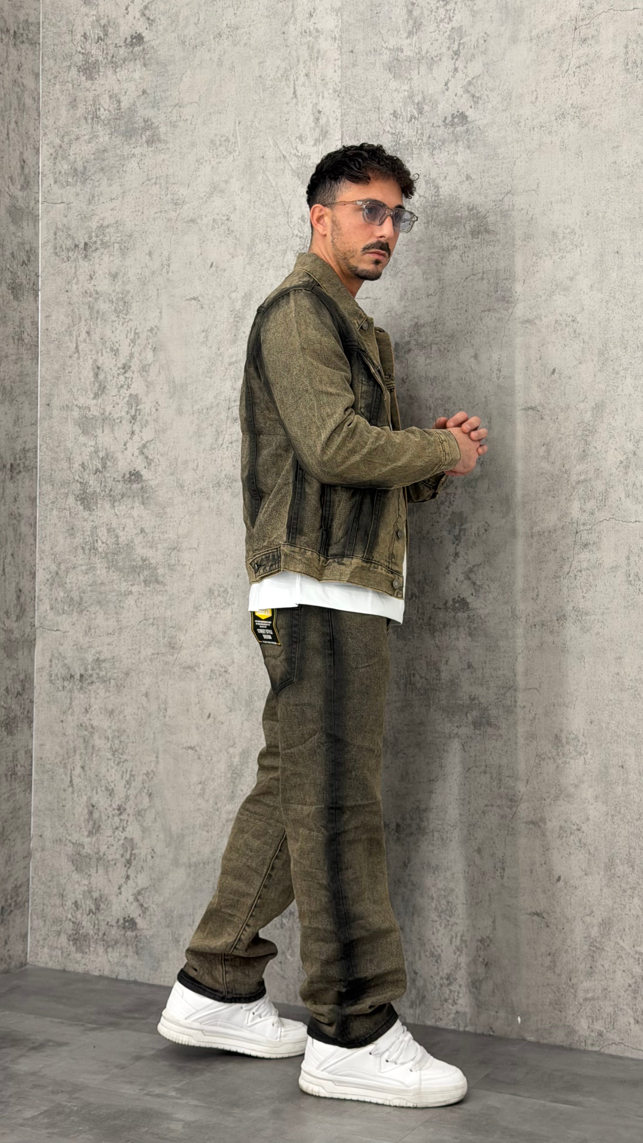 oordinato in denim lavaggio marrone con sfumature beige. Giacca crop con tasche sul petto e jeans baggy a gamba ampia. Look street contemporaneo, volumi rilassati e dettagli funzionali.