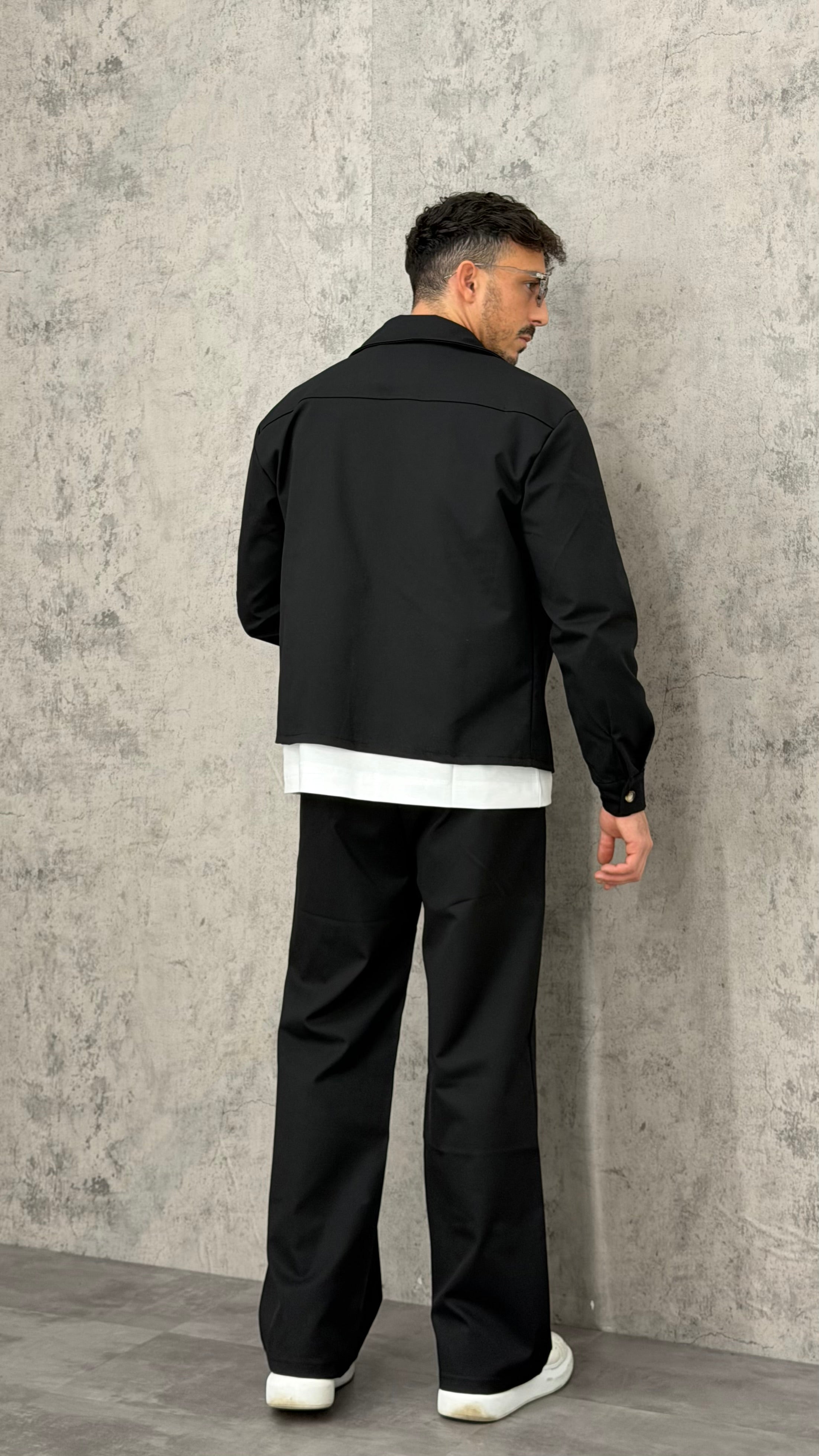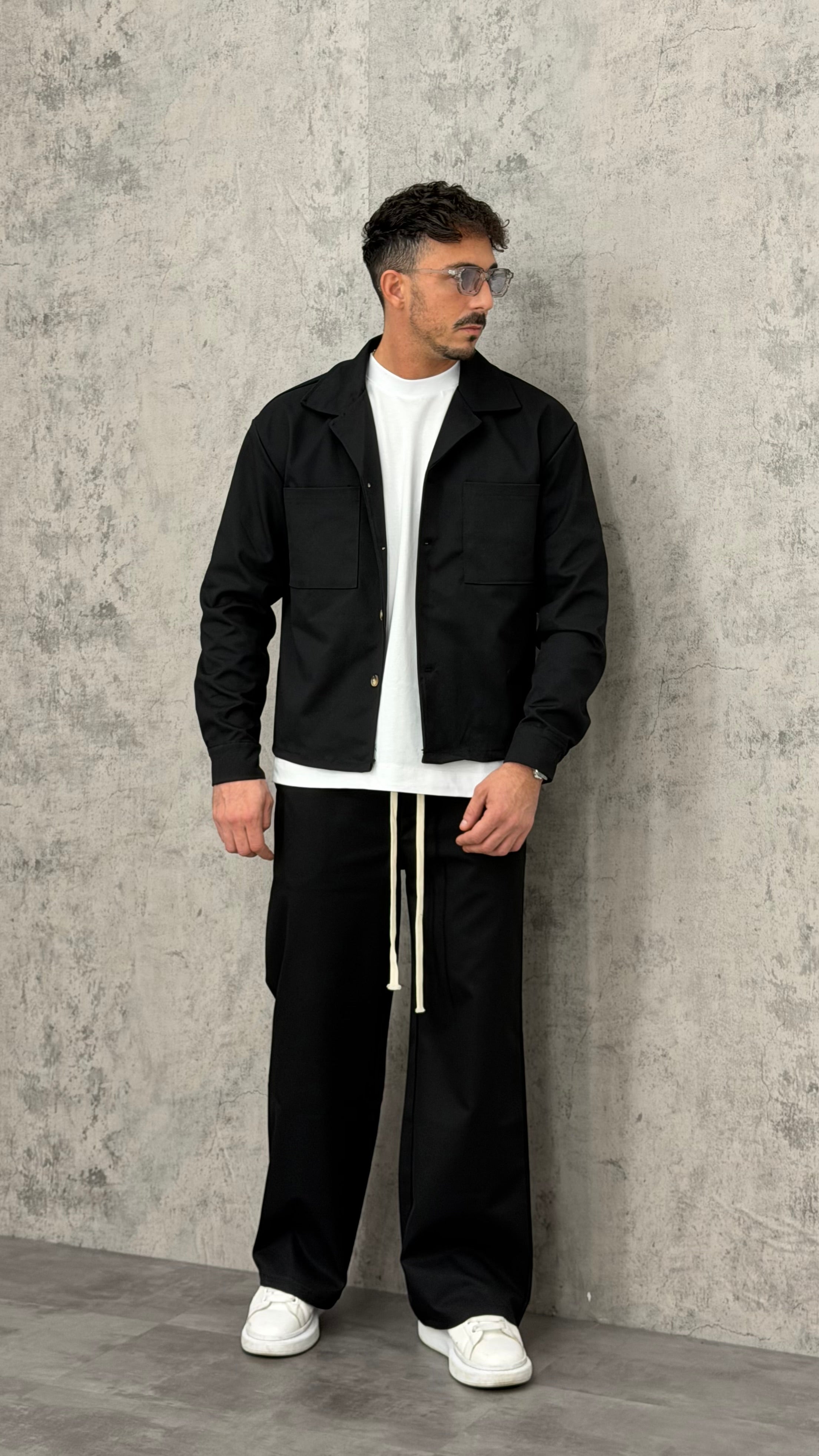 Coordinato composto da camicia crop con tasche applicate sul petto e chiusura con bottoni. Pantalone a vestibilità ampia con elastico in vita e lacci regolabili. Look utility street, comodo e strutturato.