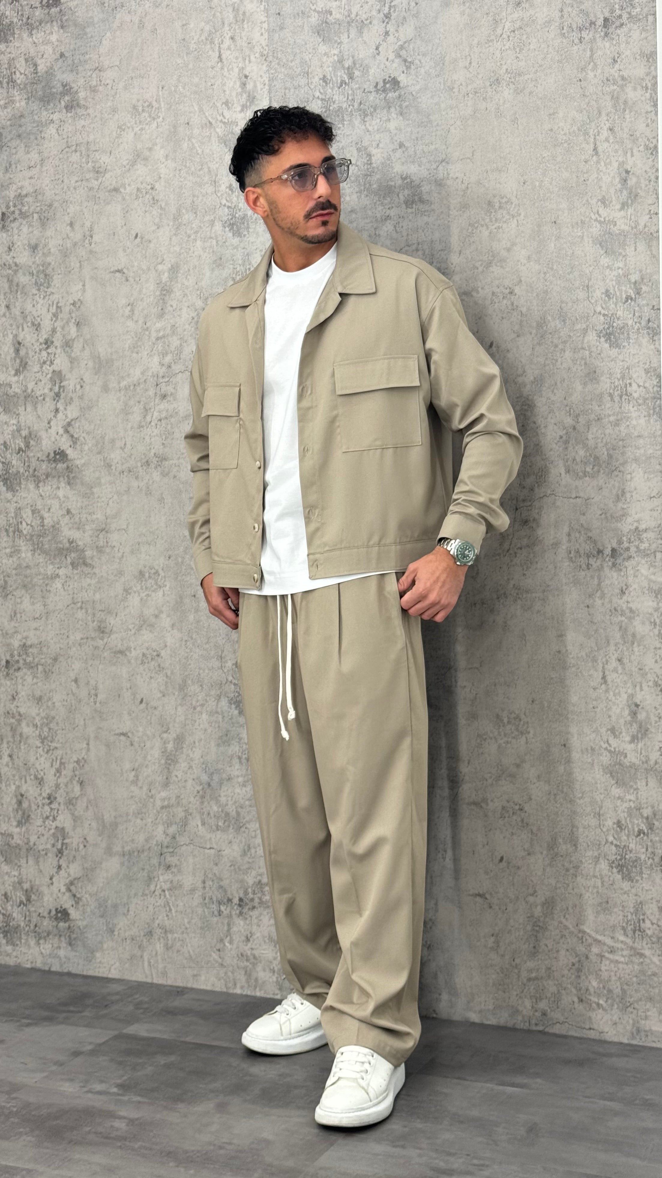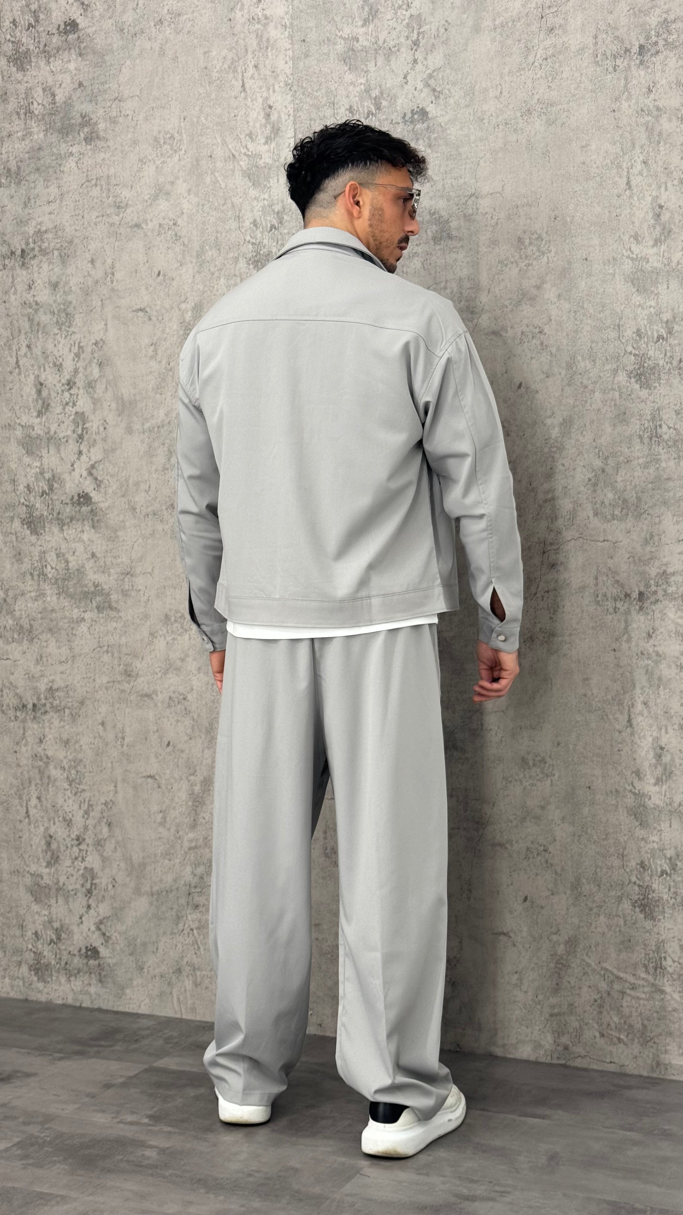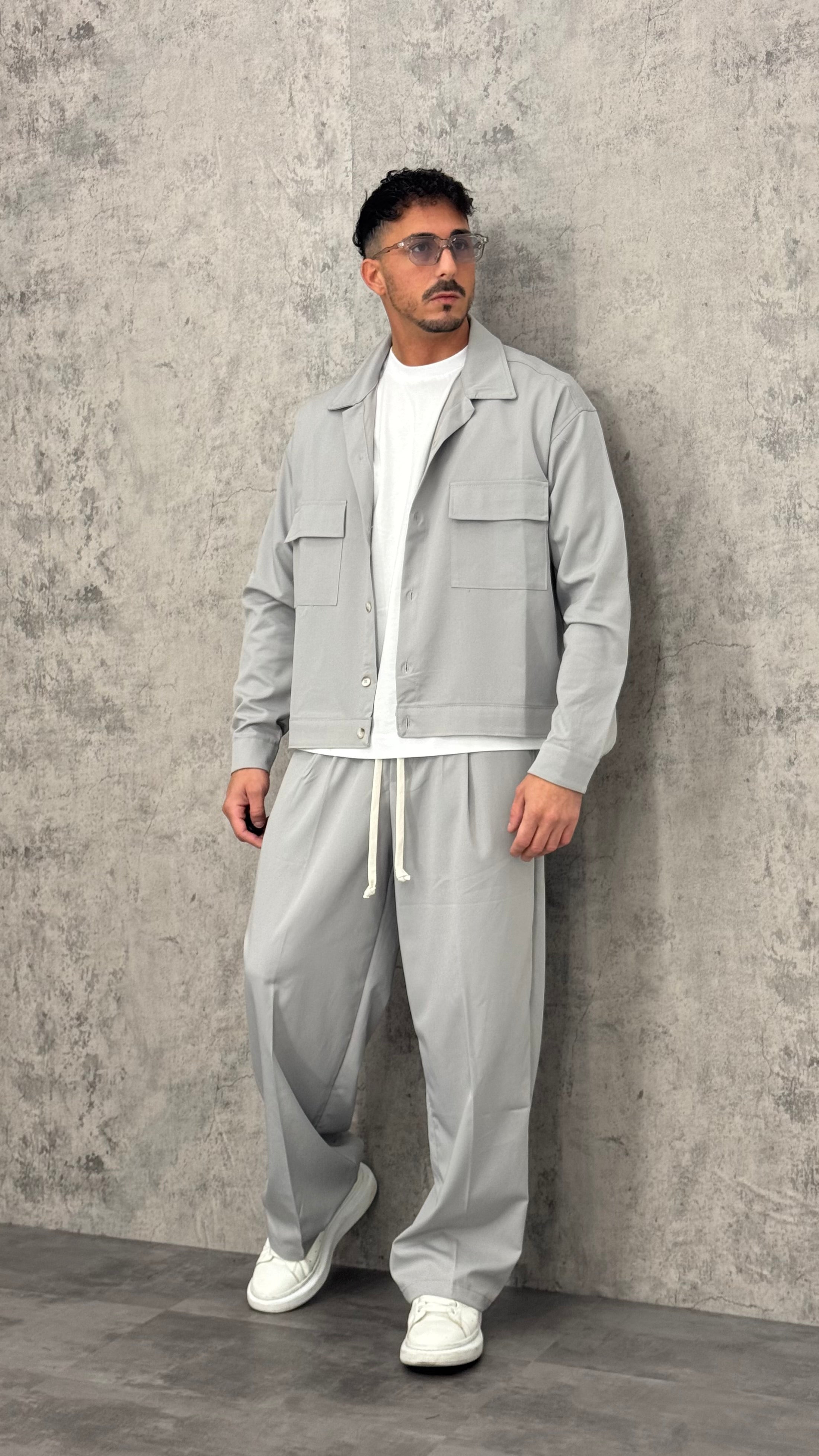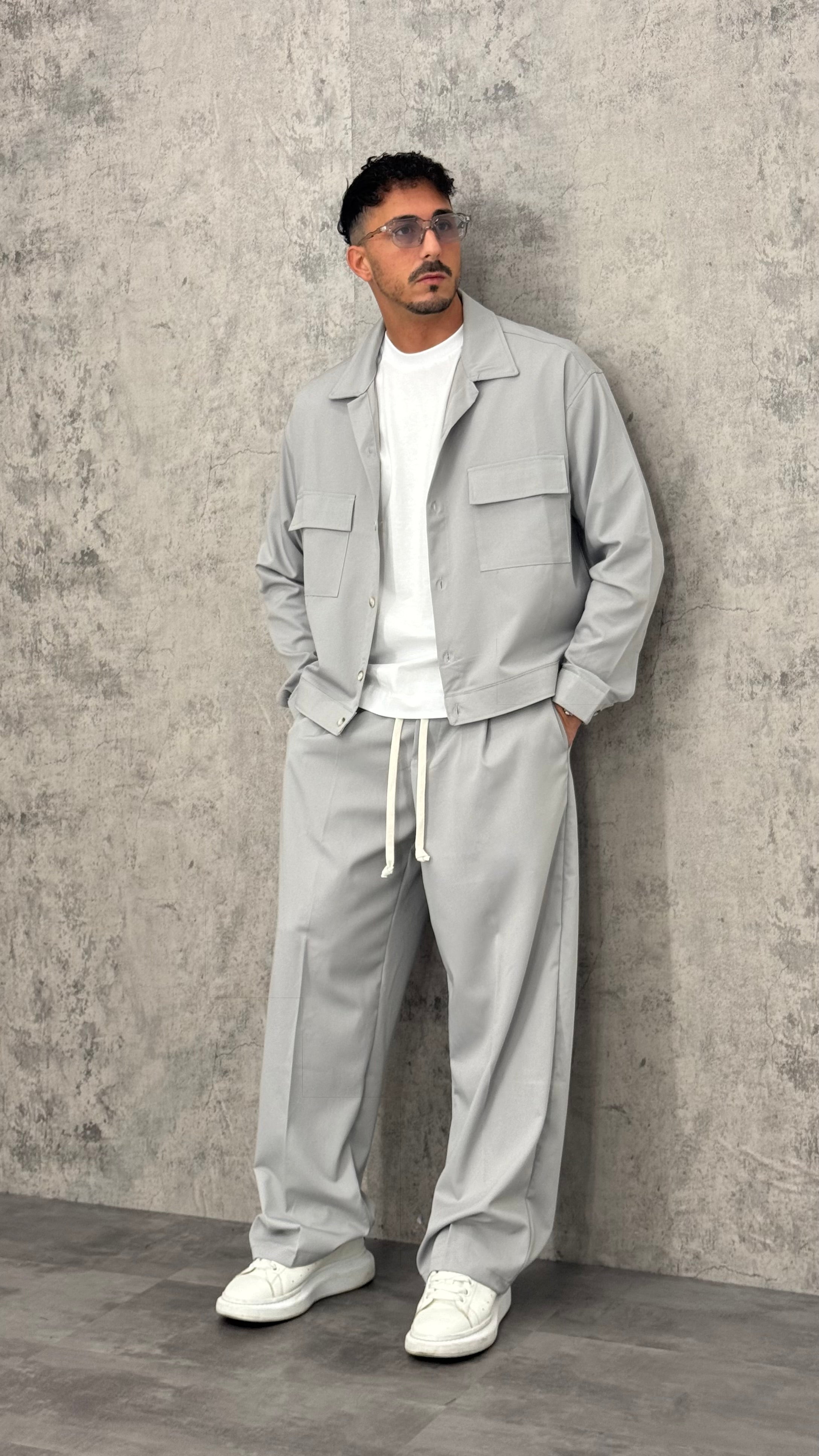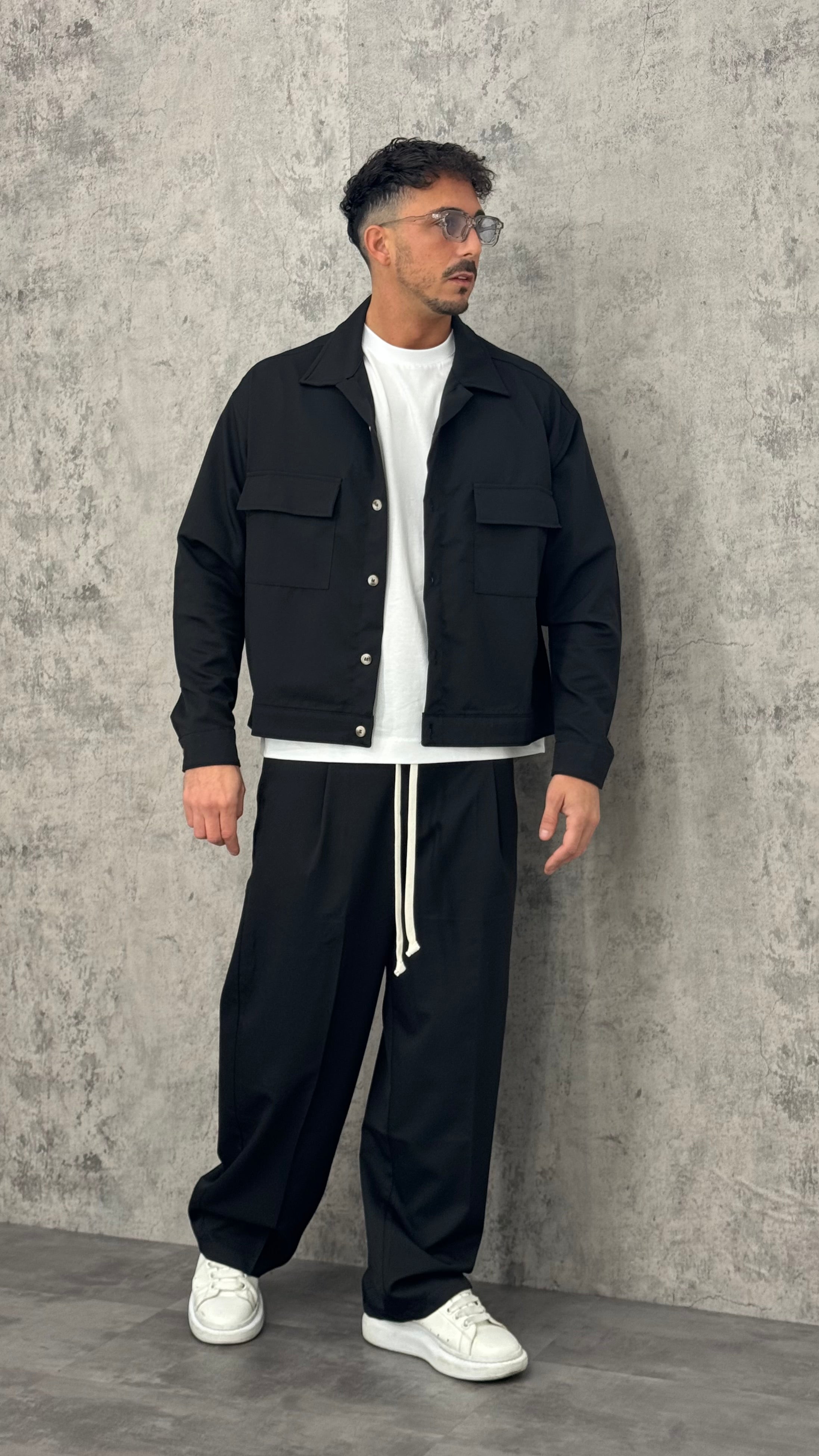 Coordinato con giacca crop e pantalone ampio. Look moderno e comodo, perfetto per outfit urban e di tendenza.