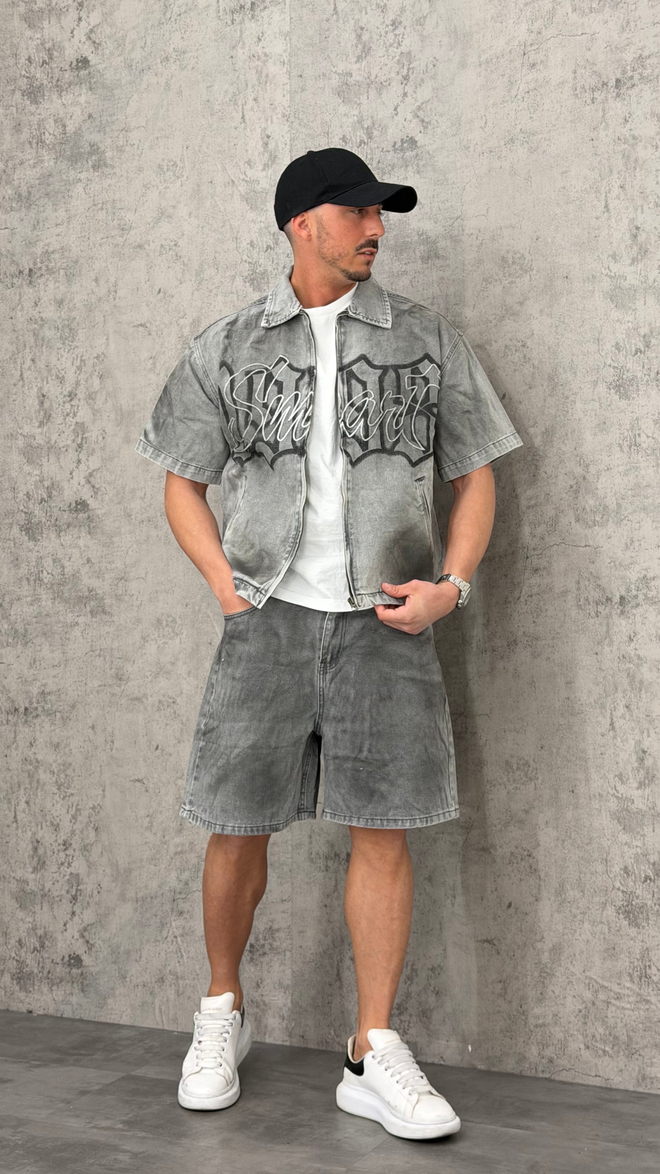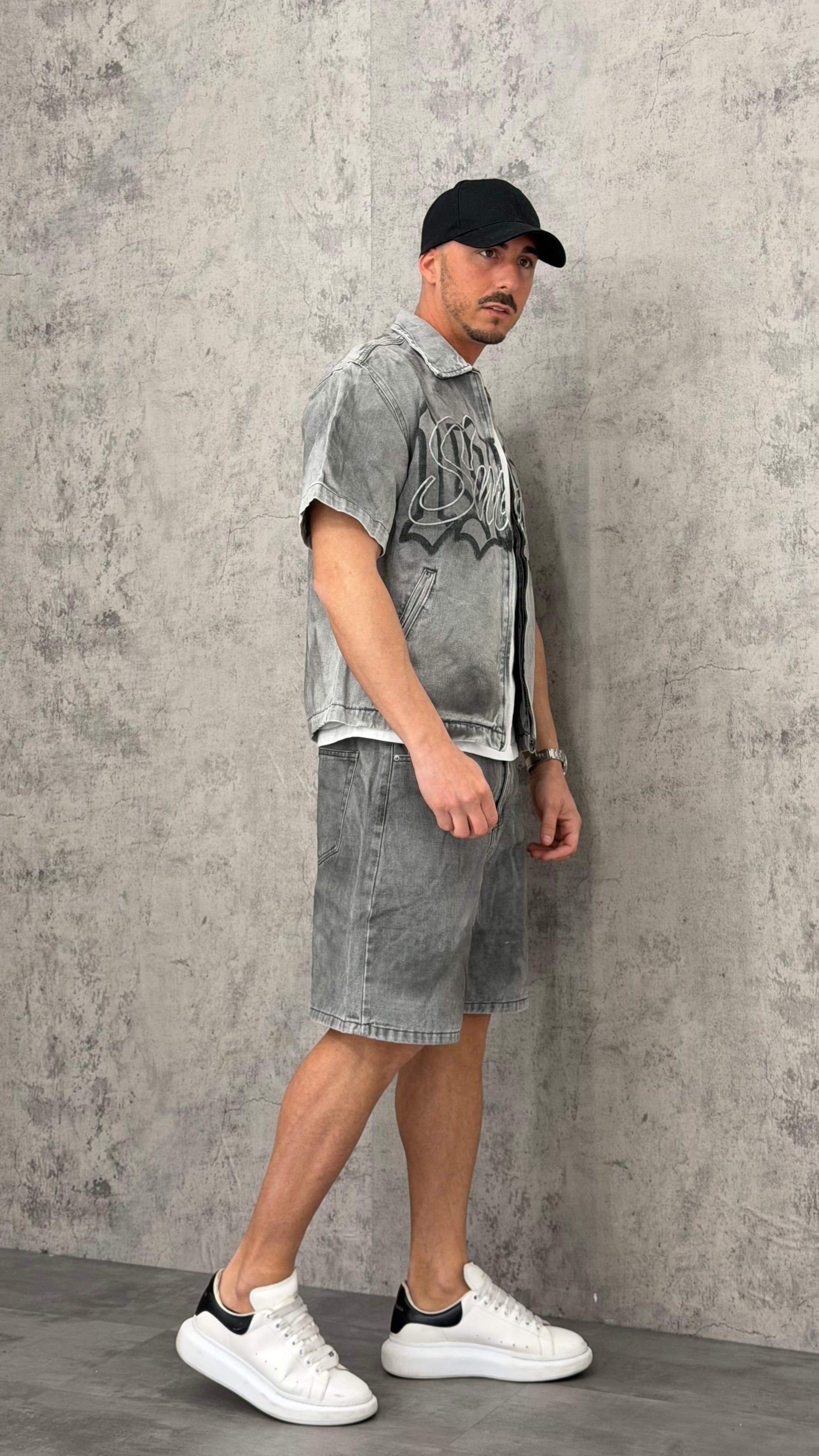 Coordinato jeans con giacca e pantaloncino grigio con sfumature nere e scritta frontale
