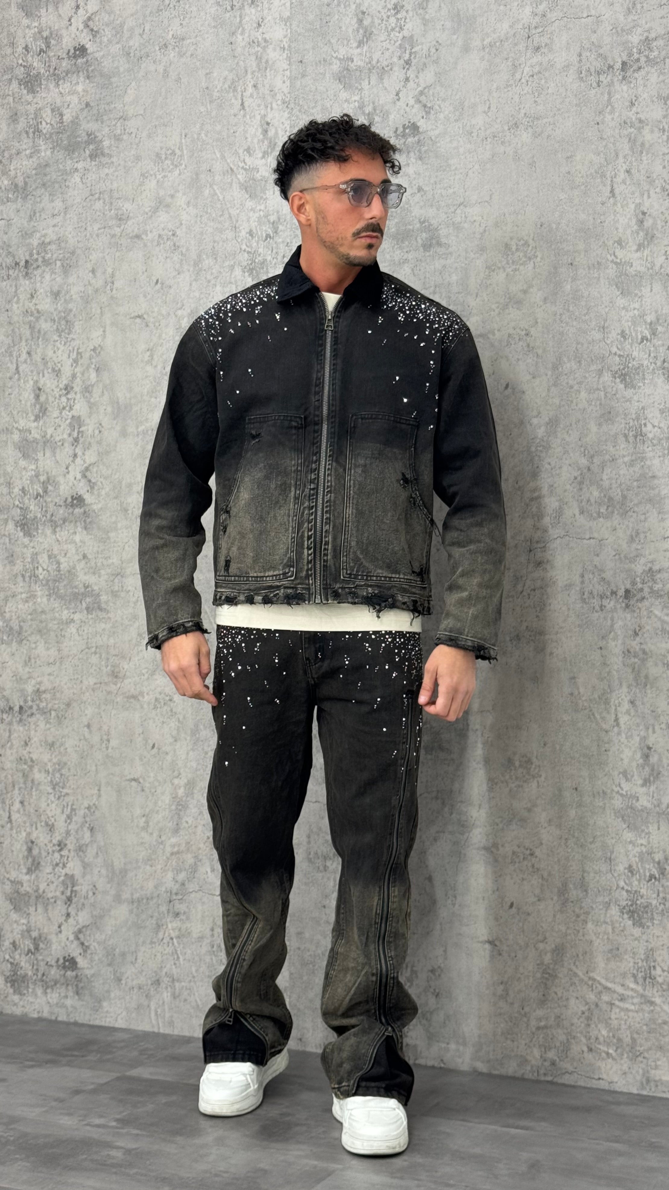 Coordinato sabbia in denim con giacca zip e dettagli glitter, look street moderno e brillante