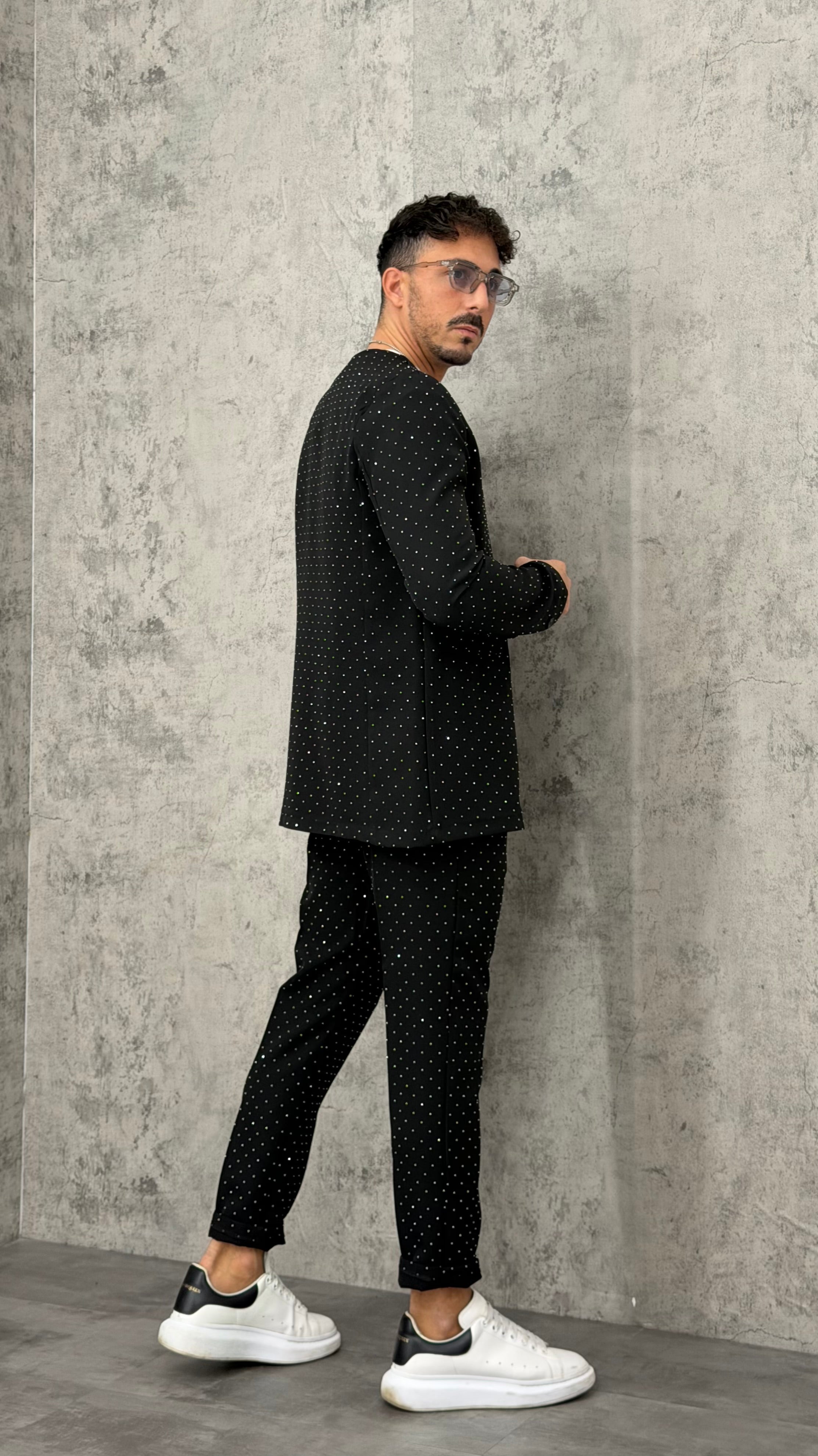 Coordinato slim interamente glitterato. Giacca minimal senza colletto e bottone singolo tipo cardigan, pantalone aderente. Design luminoso e impatto visivo forte.