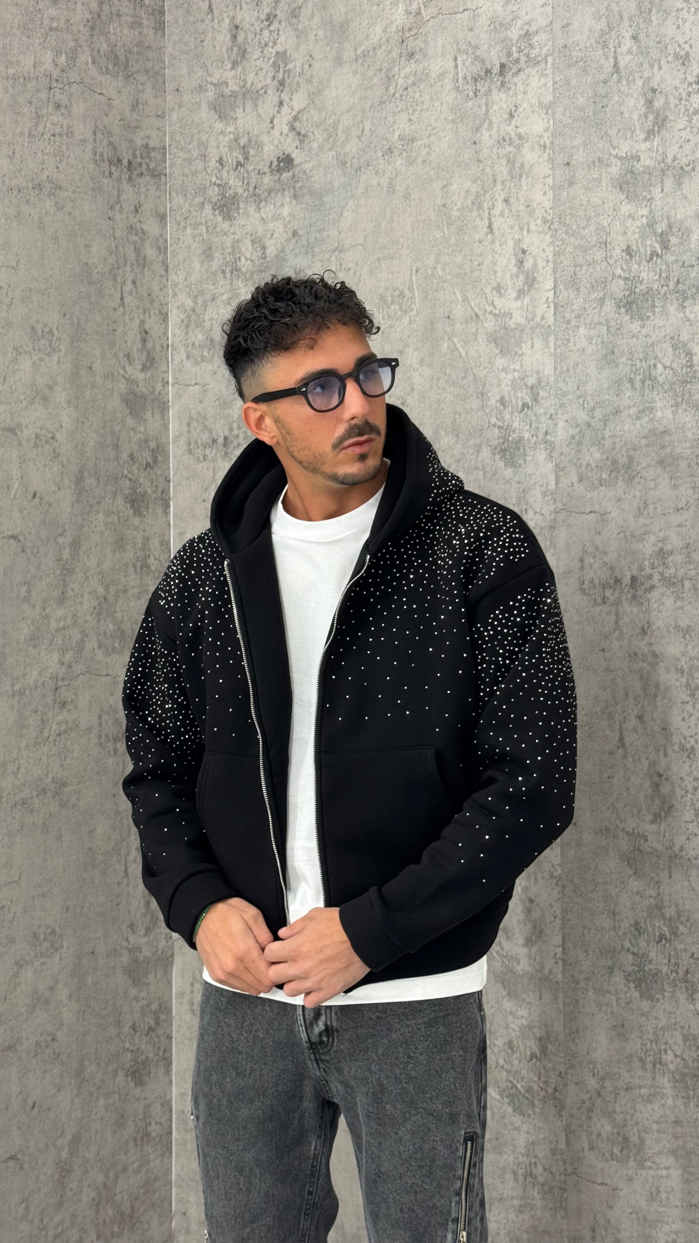 Felpa uomo in cotone felpato con brillantini a cascata e cerniera full zip. Vestibilità comoda, interno morbido e dettagli luminosi che rendono il capo elegante ma perfetto per un look casual urbano.