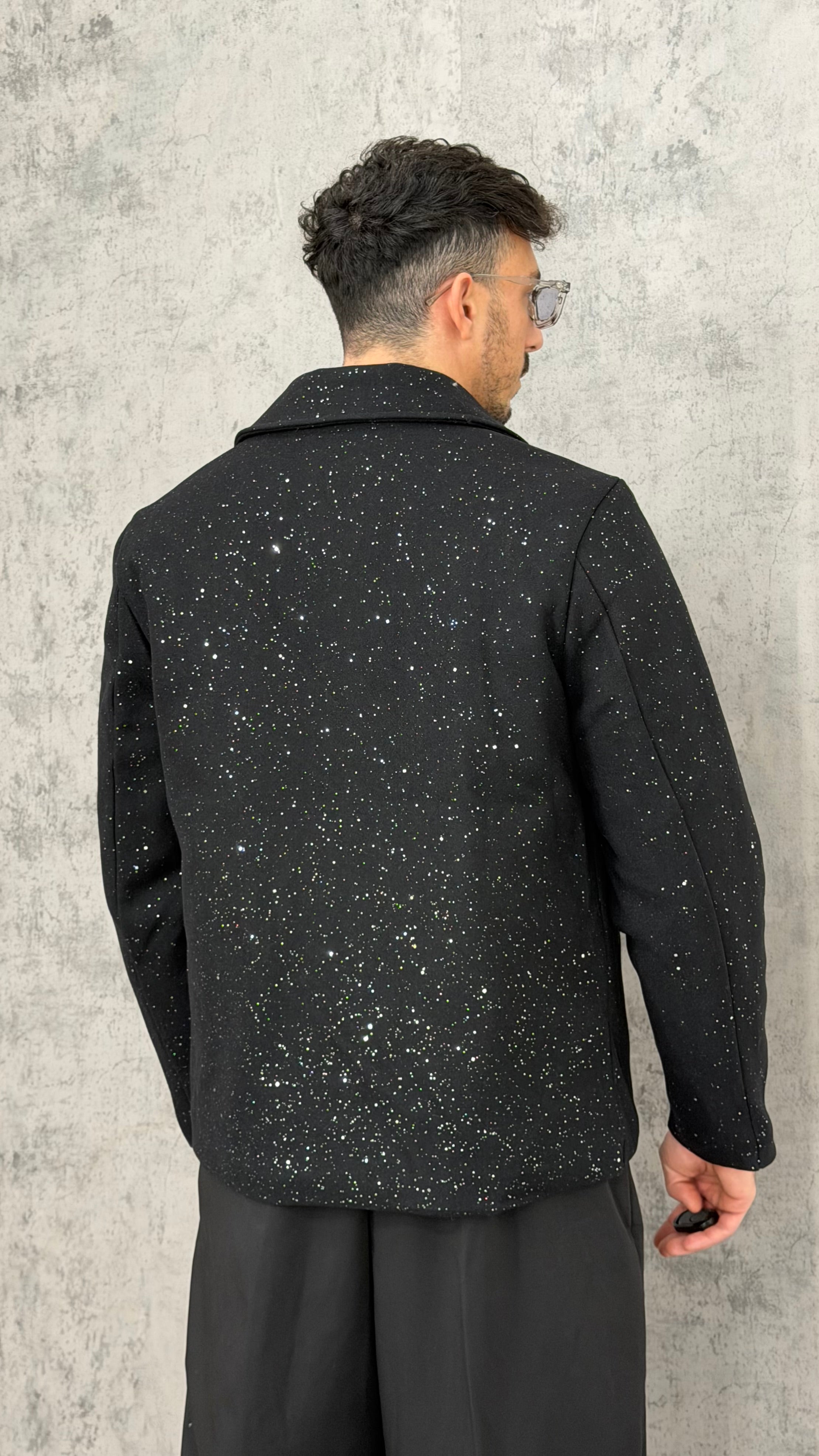 Giacca in tessuto brillantinato con chiusura zip frontale. Vestibilità slim, design street-glam con impatto luminoso.