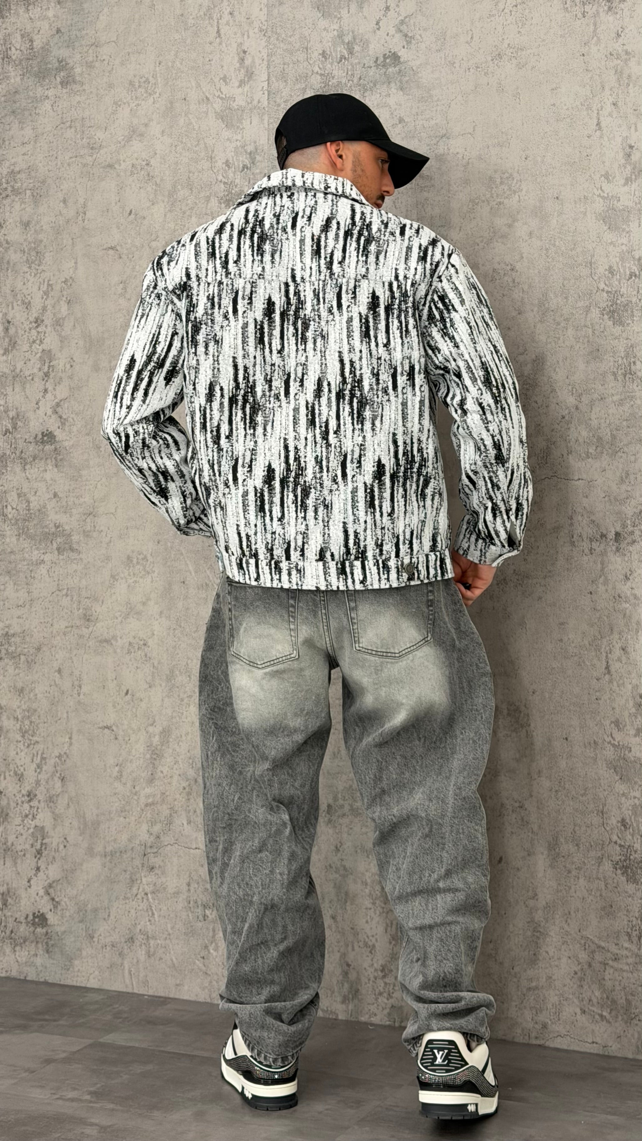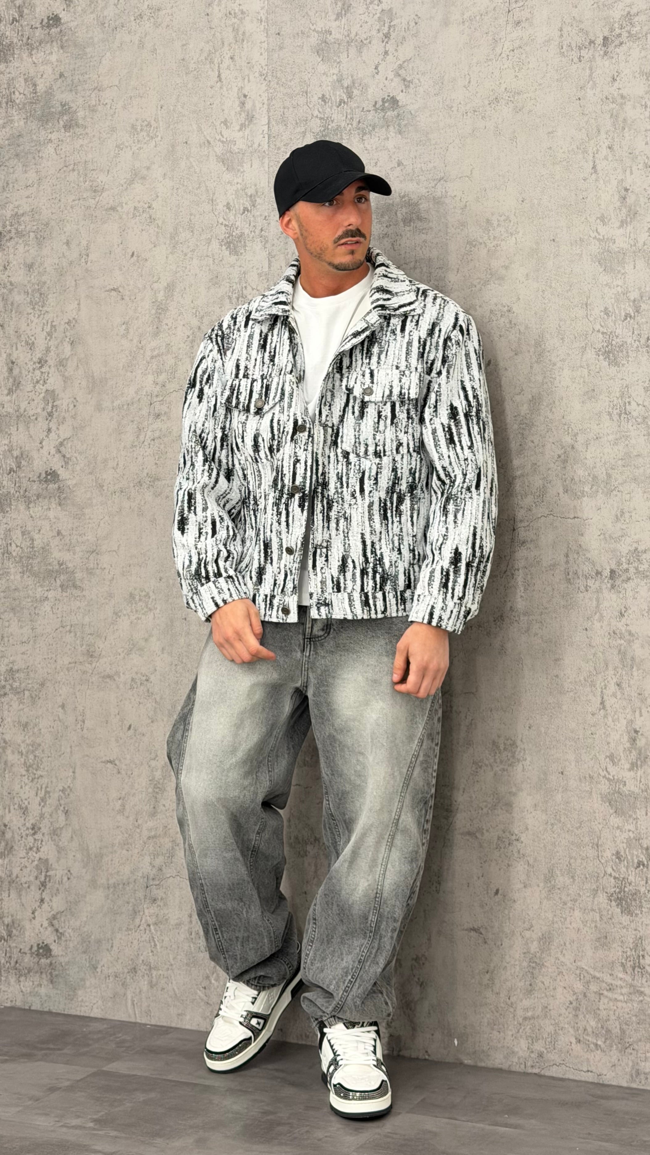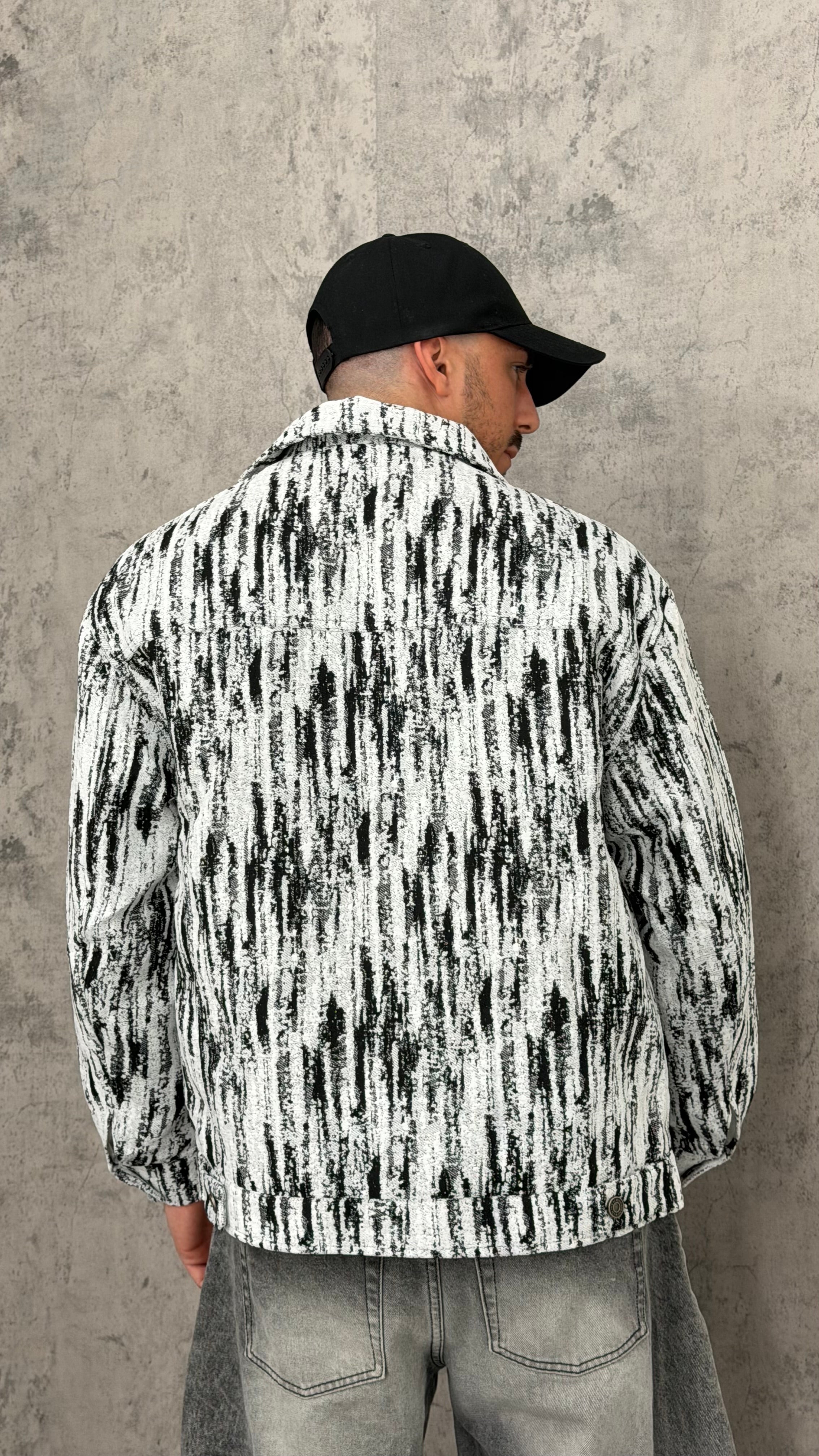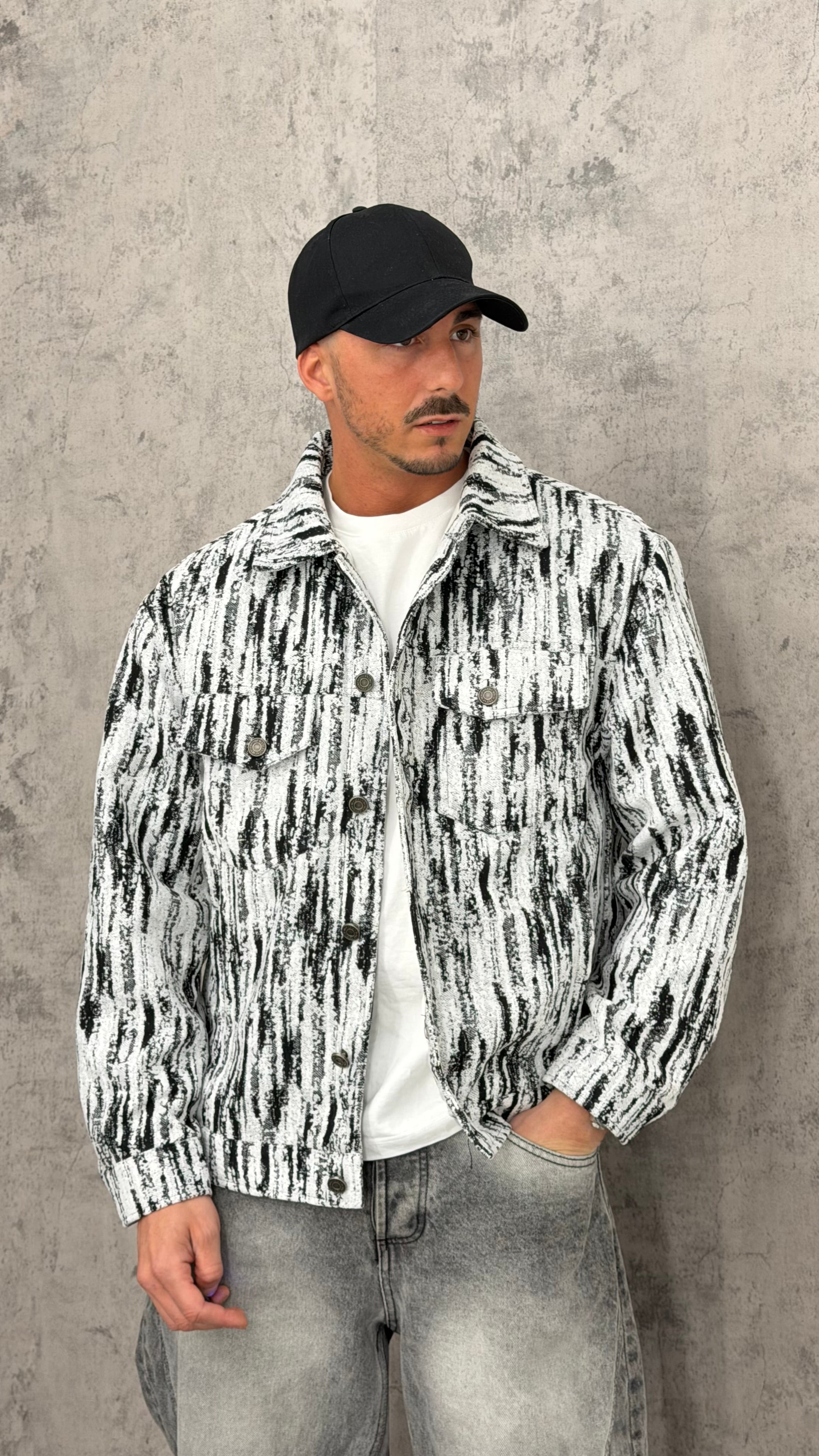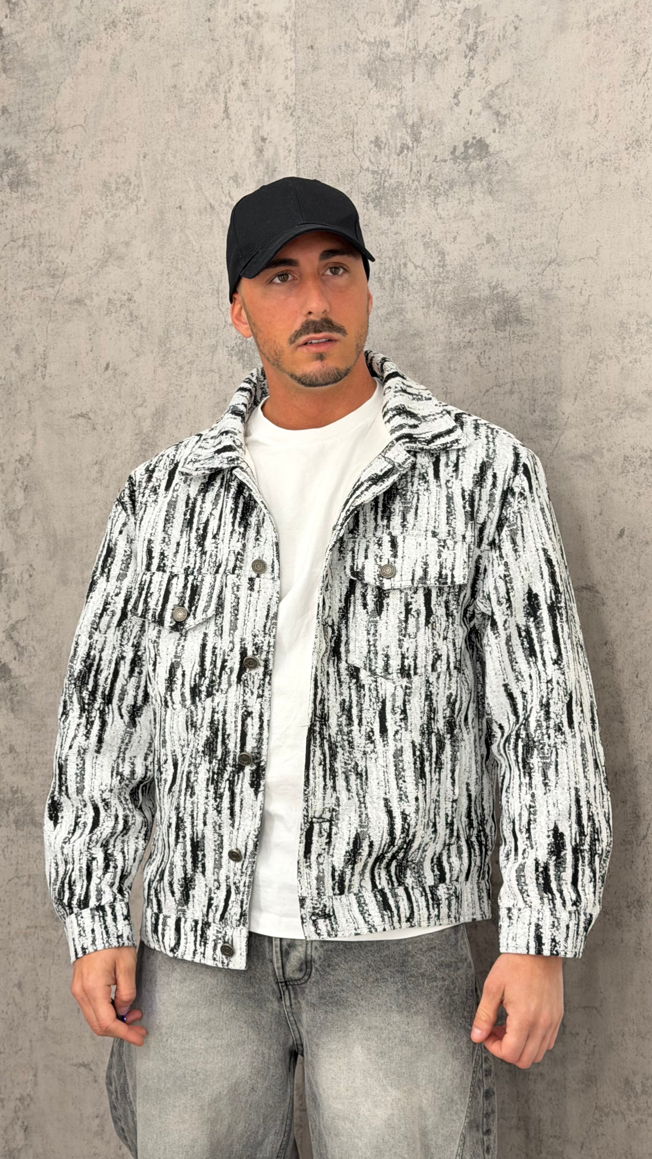 Giacca crop con trama bianca e nera, zip, colletto e chiusura anche con bottoni. Design street contemporaneo dal look grafico e d’impatto, perfetta per outfit urban con jeans baggy, pantaloni balloon o layering con hoodie