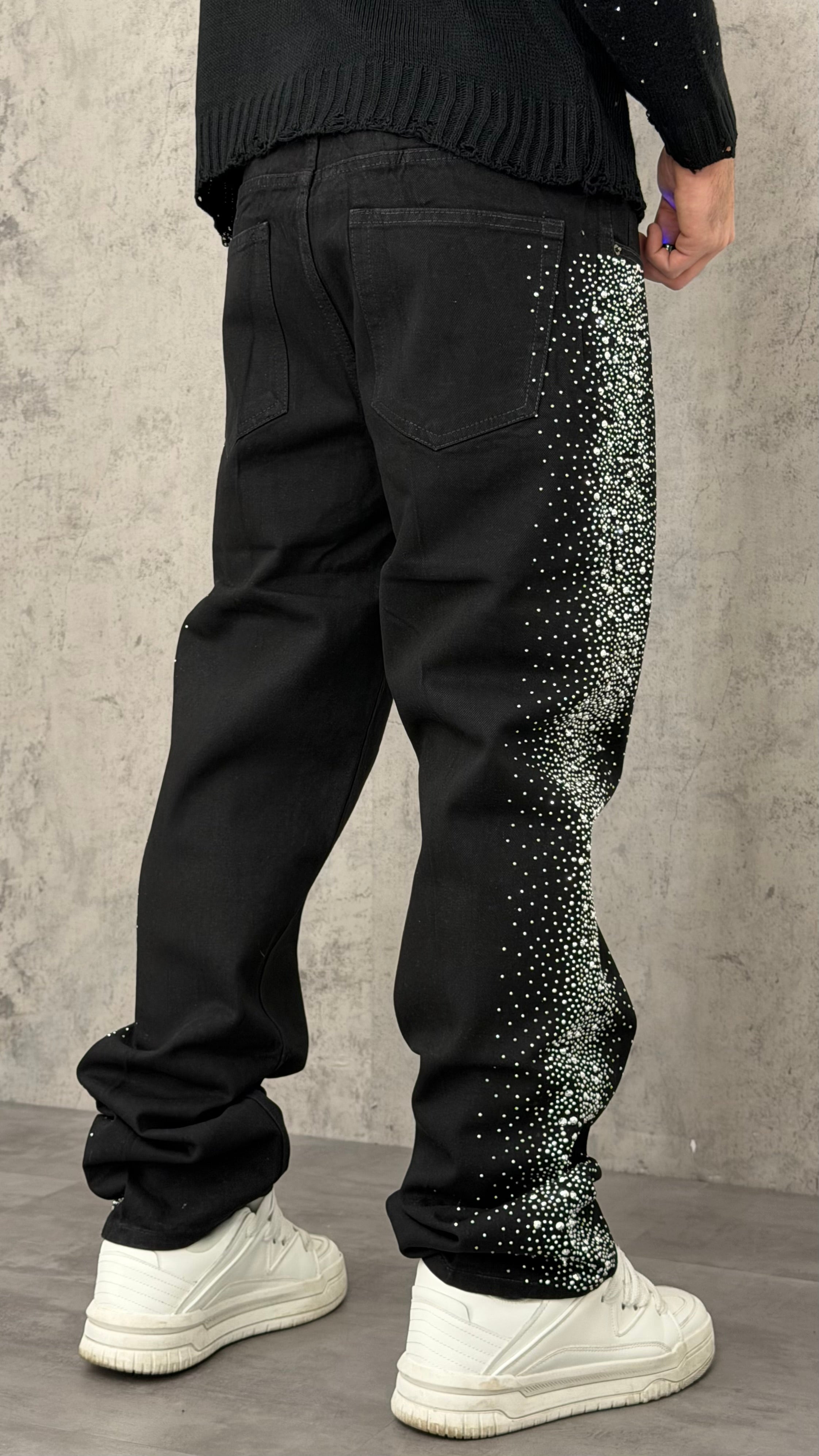 Jeans baggy neri con dettagli brillanti lungo le bande laterali