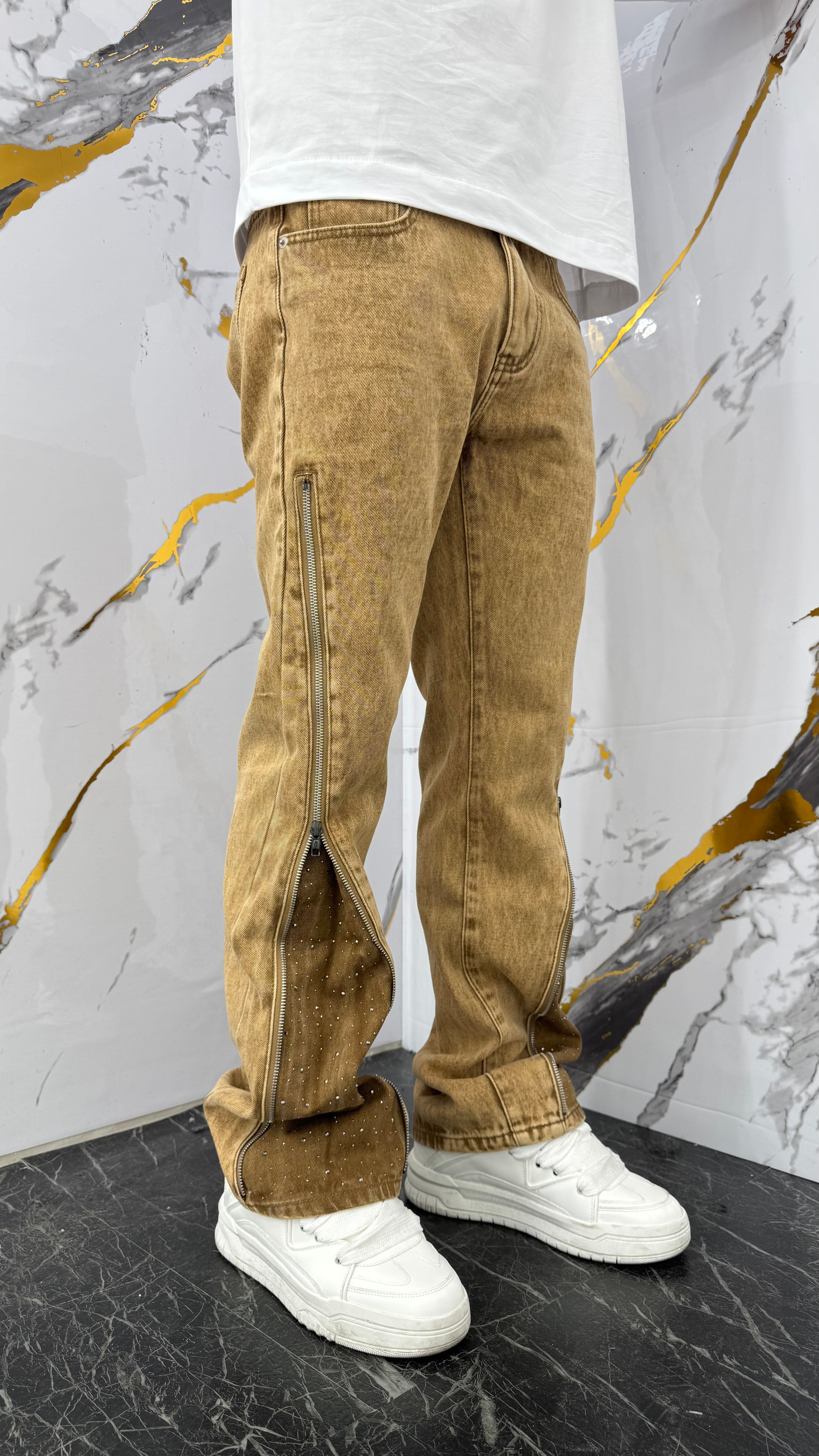 Jeans flare con zip laterali, brillantini all'interno e lavaggio marrone chiaro