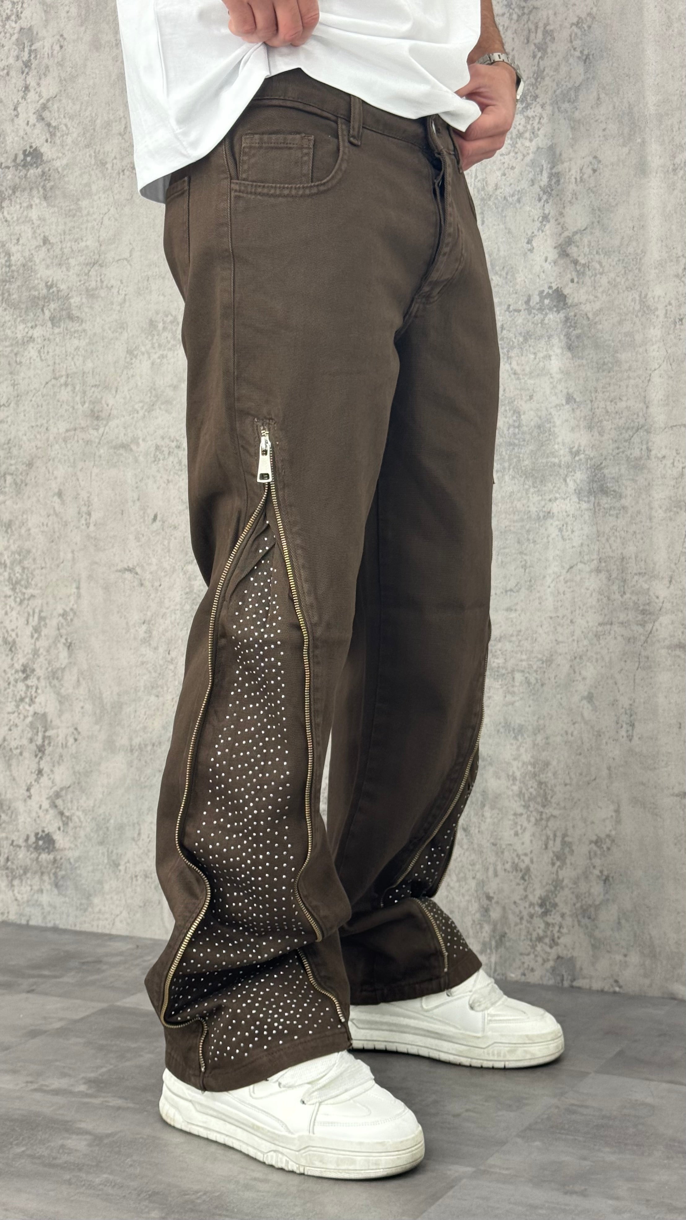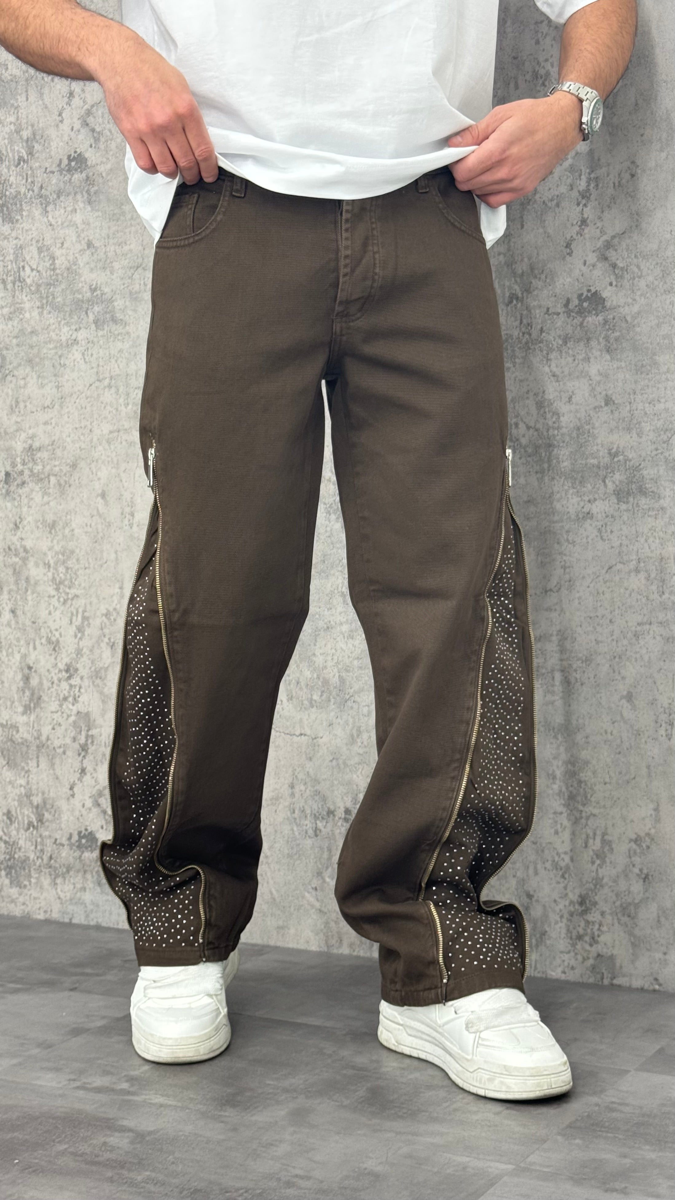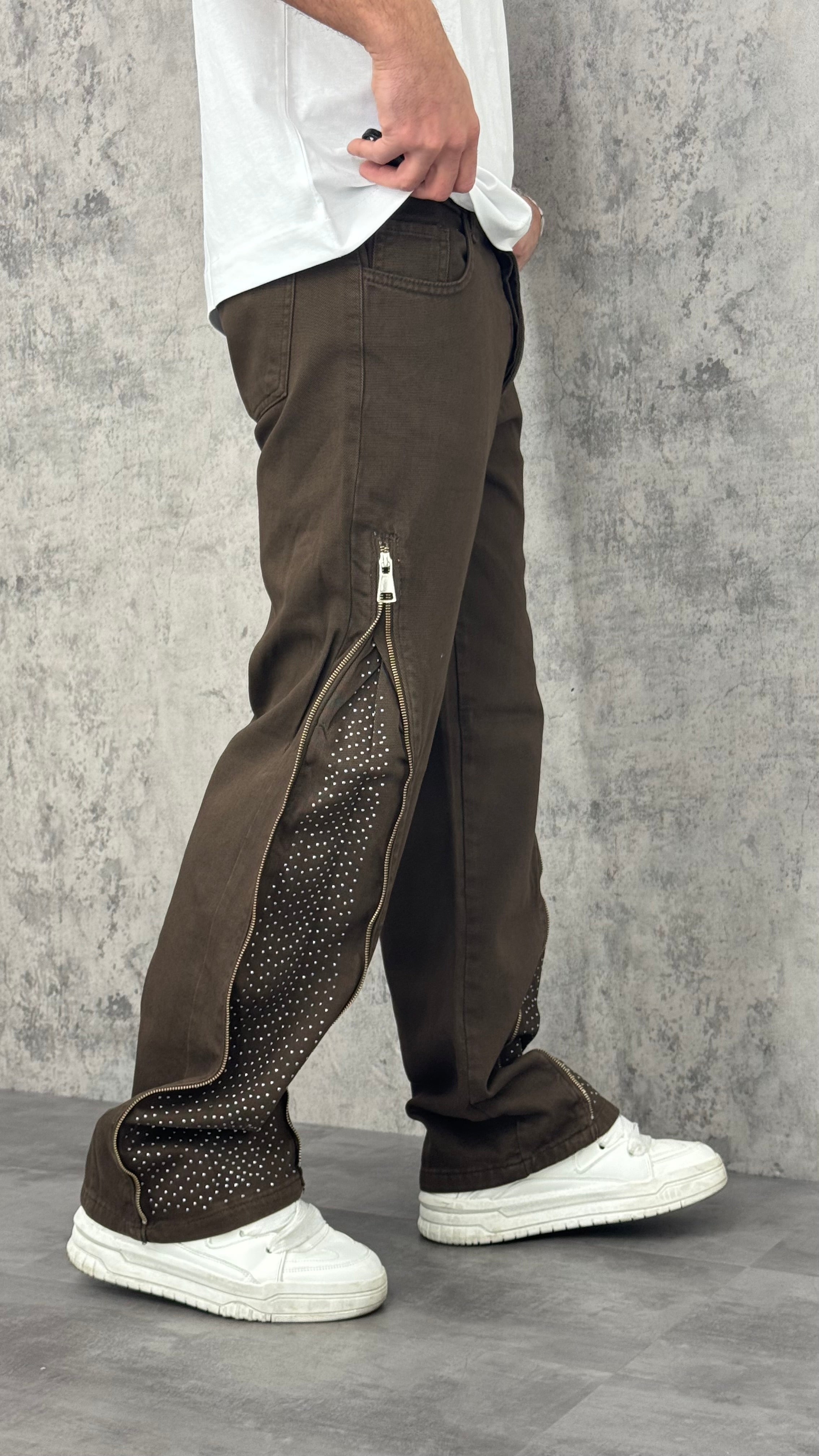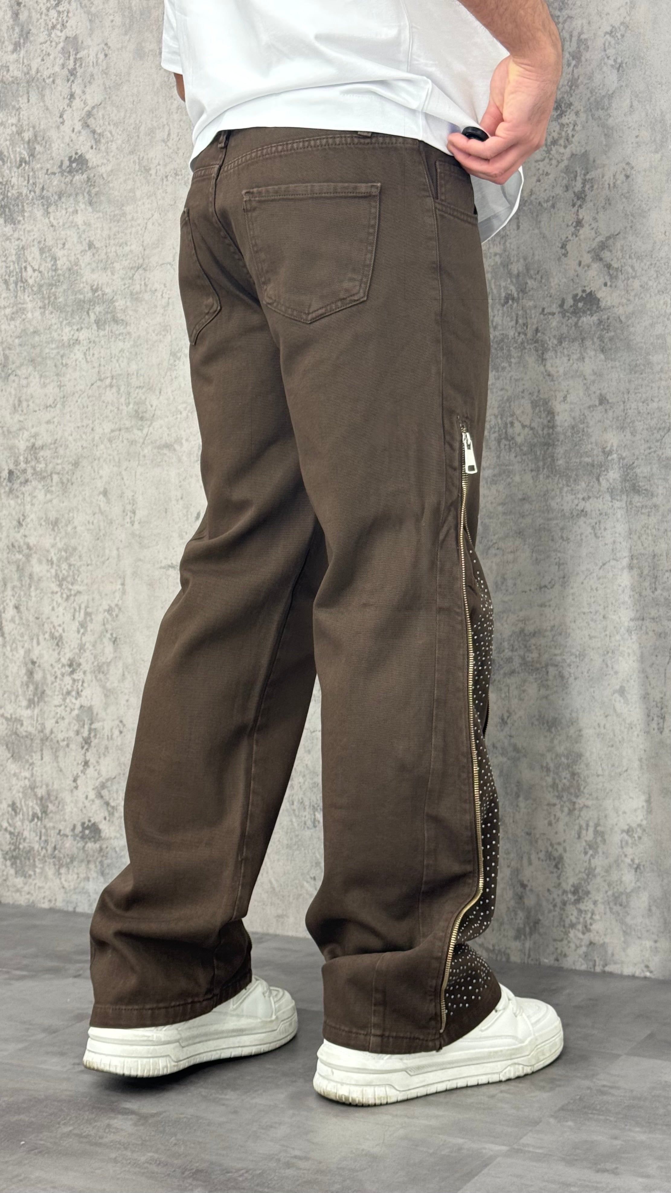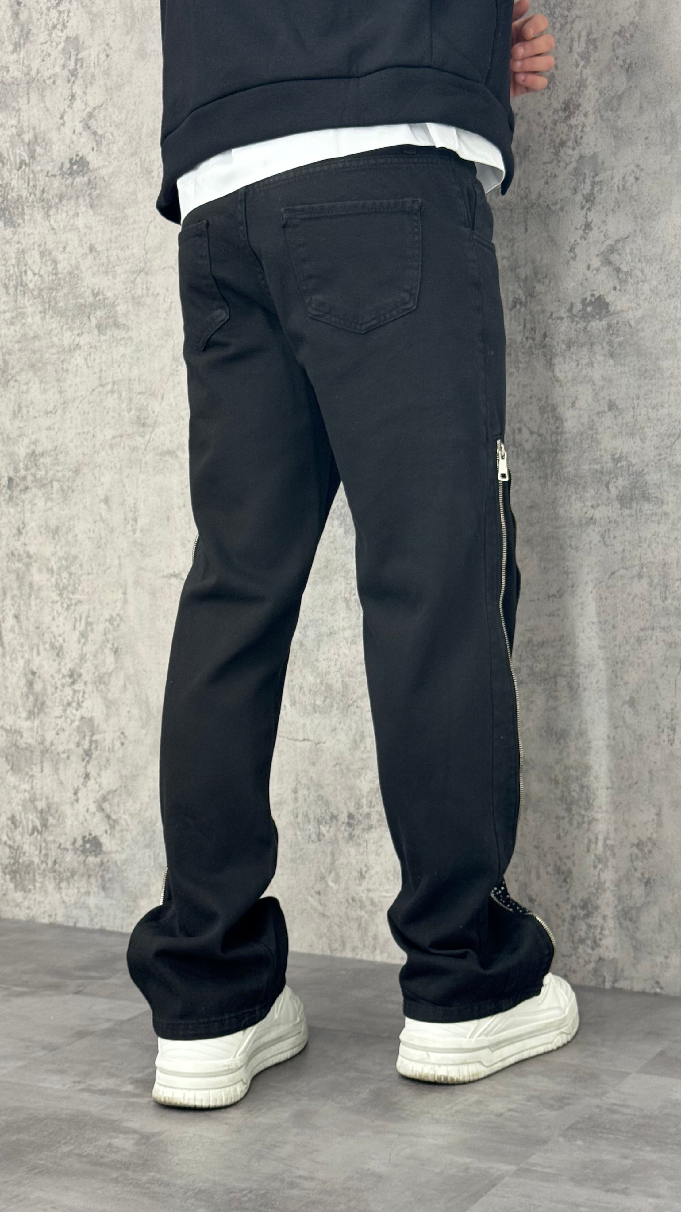 Jeans flare uomo monocolore con zip laterali e interno con brillantini. Stile originale e moderno, per un look casual con un tocco di carattere.
