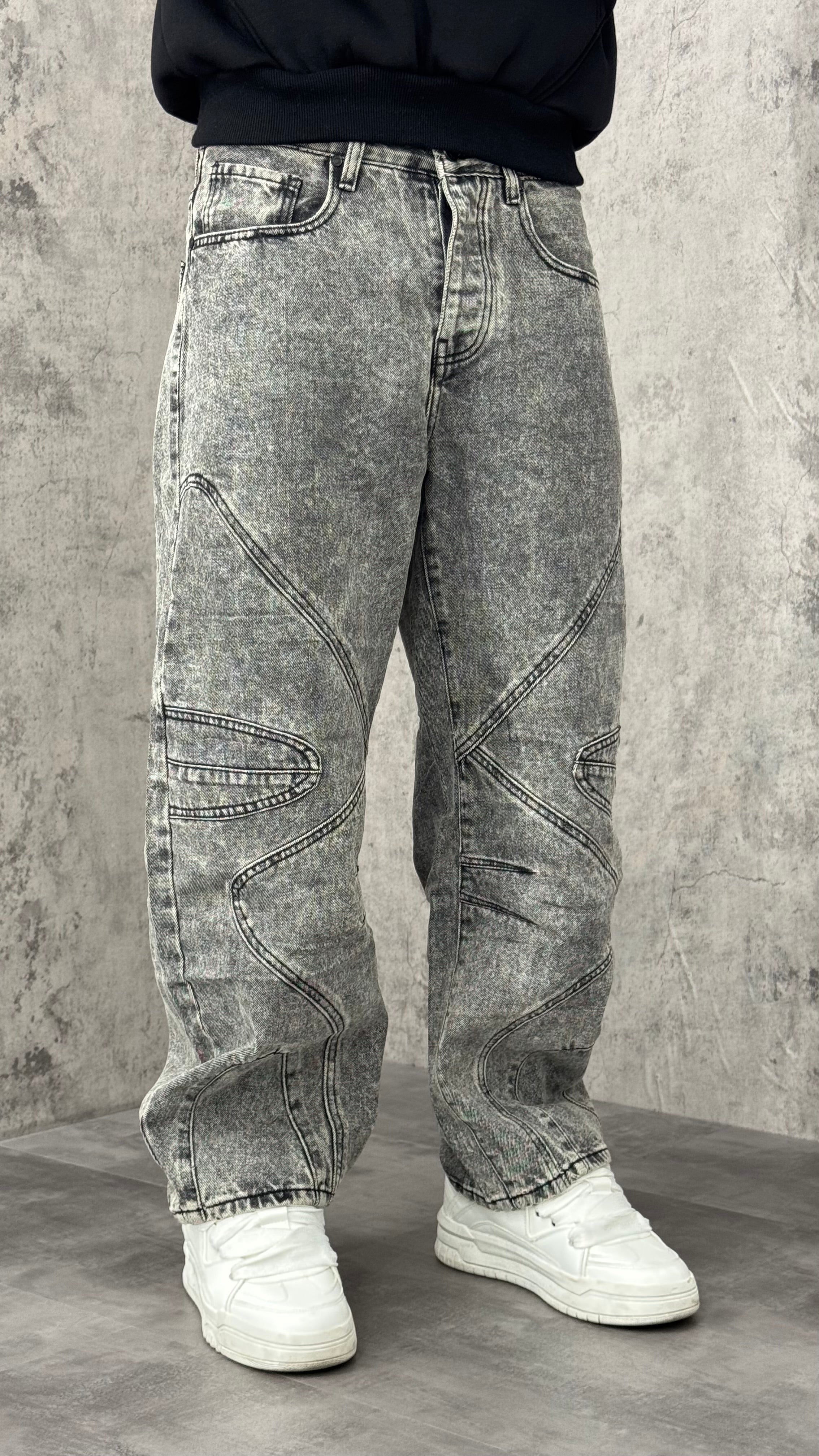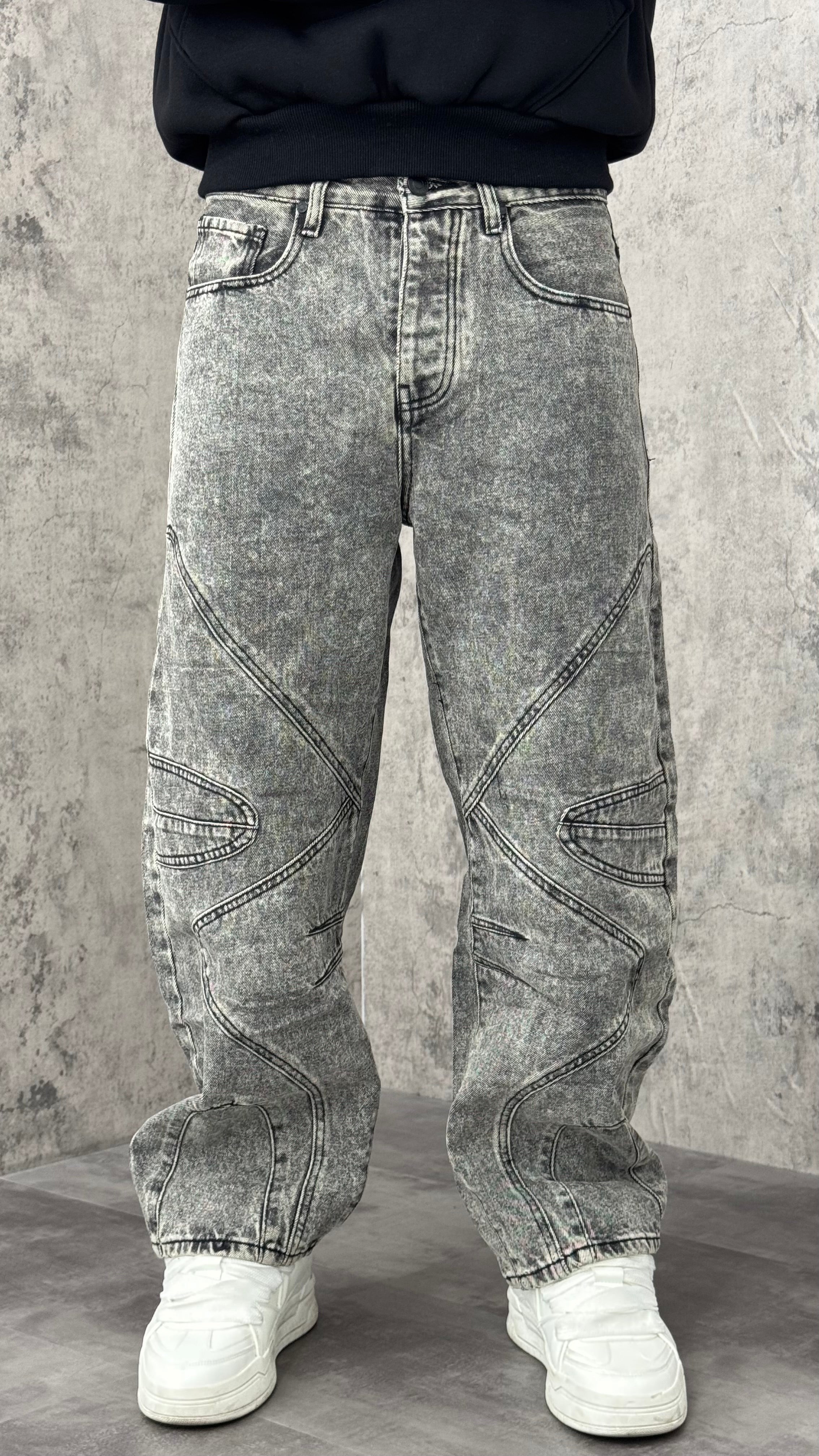 Jeans balloon grigio con cuciture multiple
