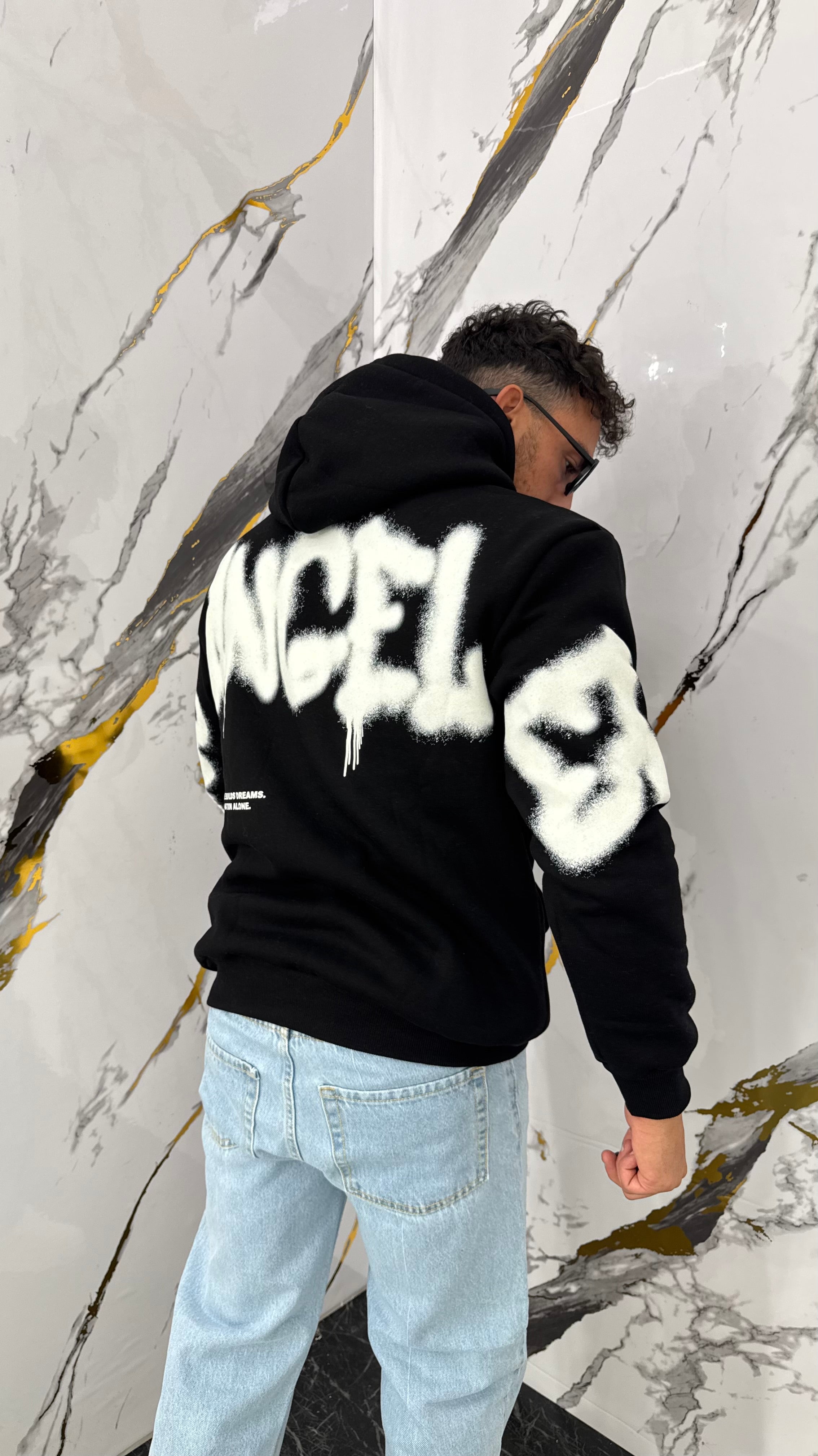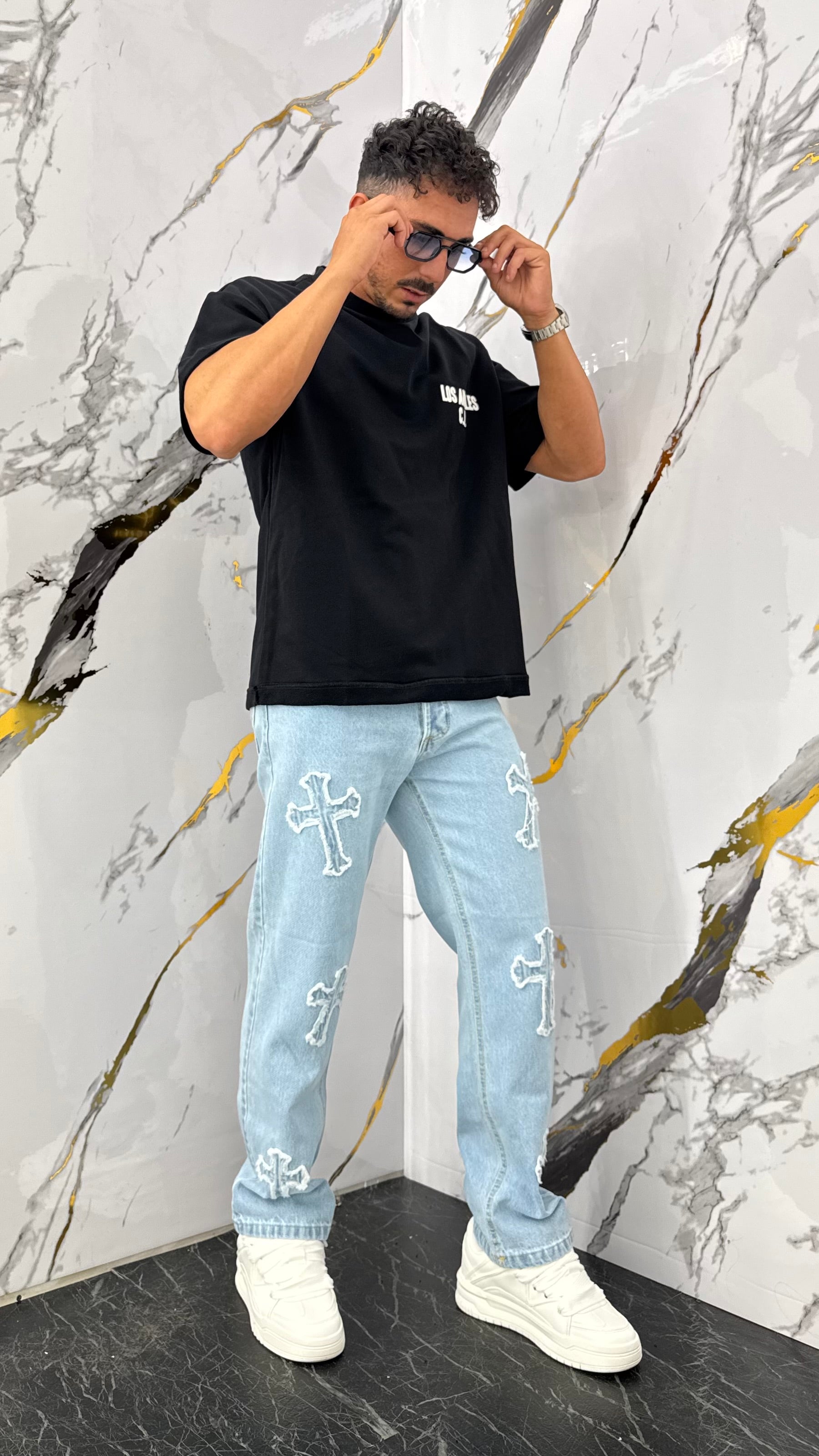 Realizzato in denim lavato con effetto used, presenta rotture decorative a forma di croce che valorizzano il look streetwear. Vestibilità regolare.