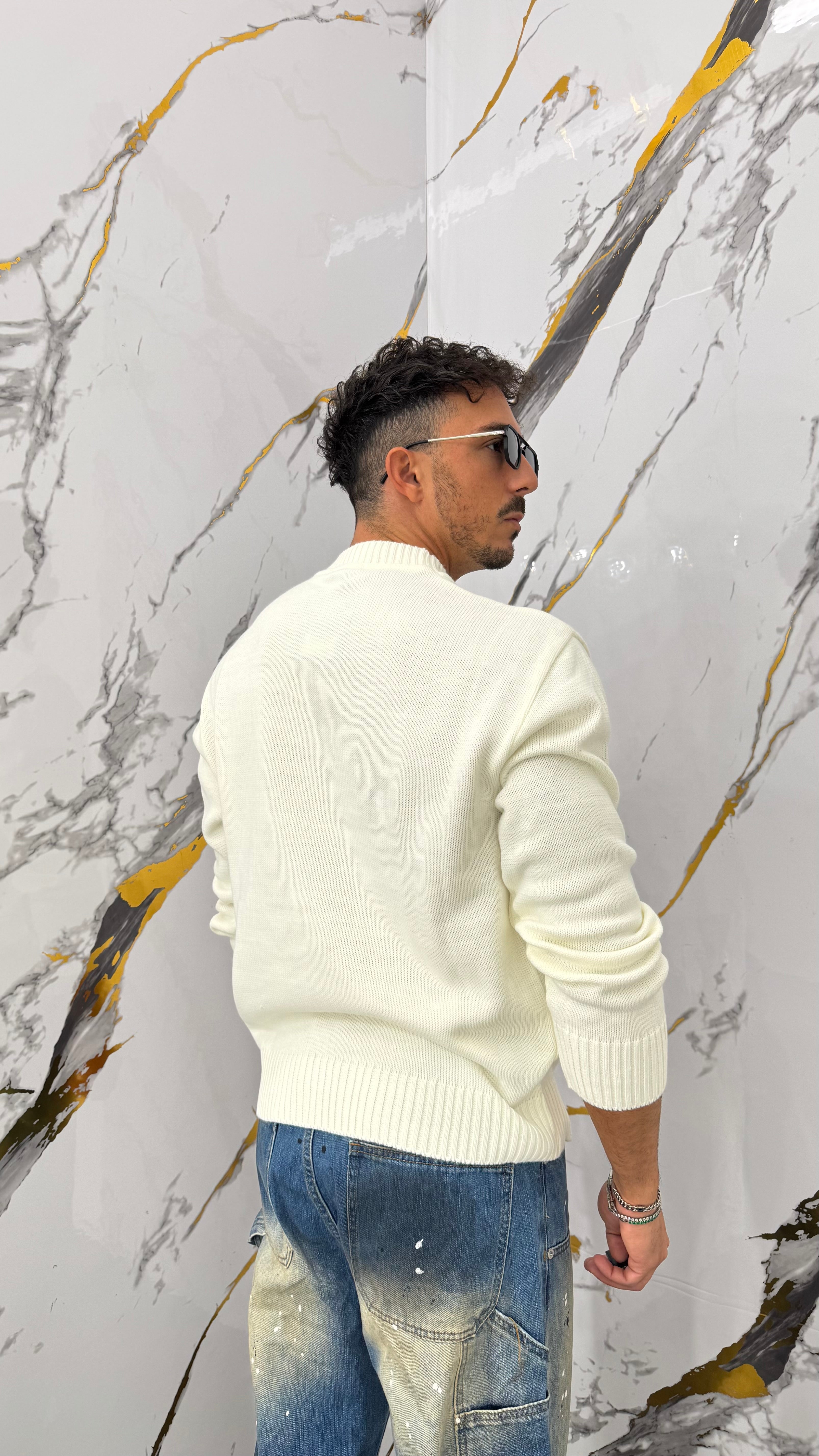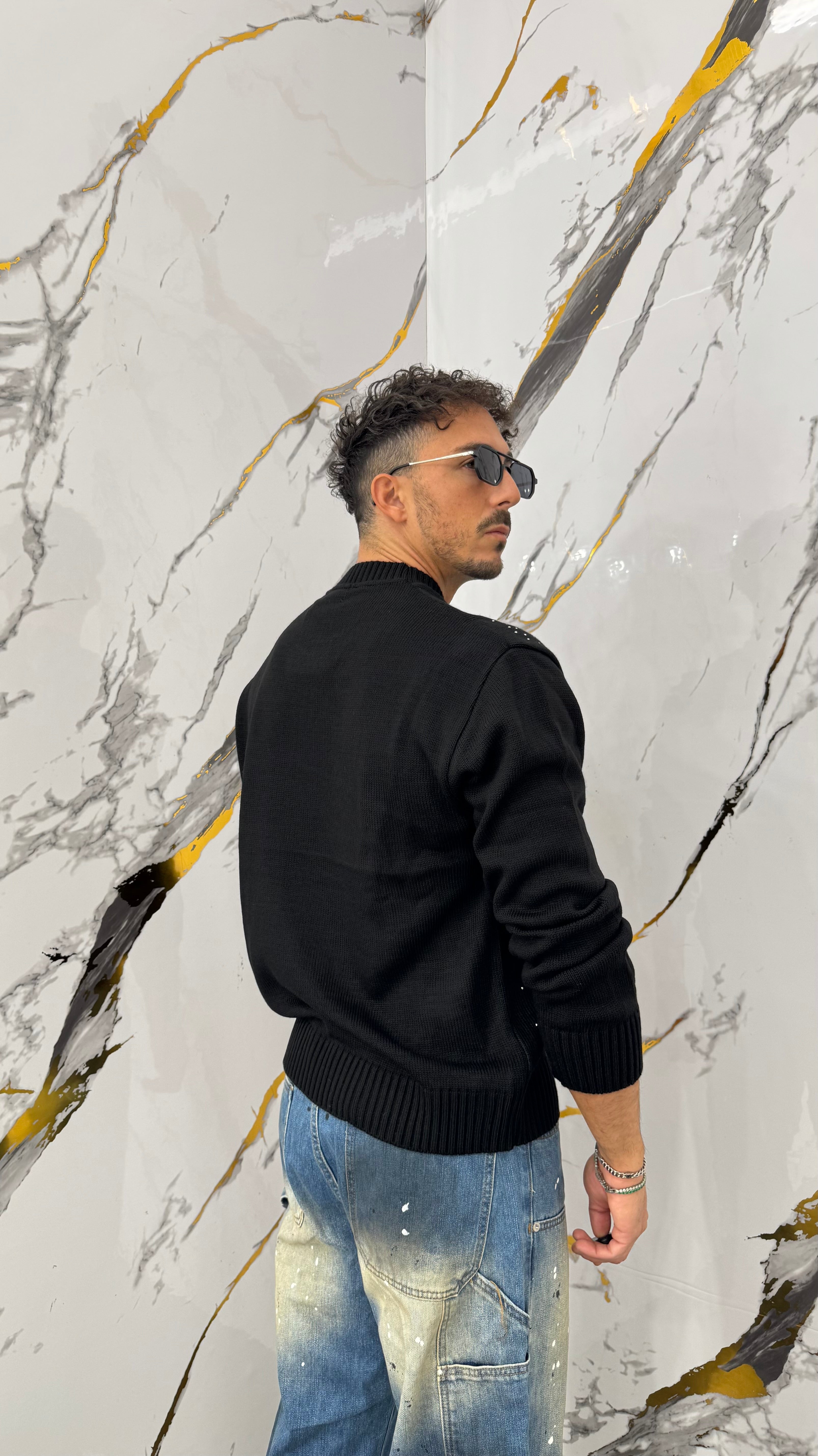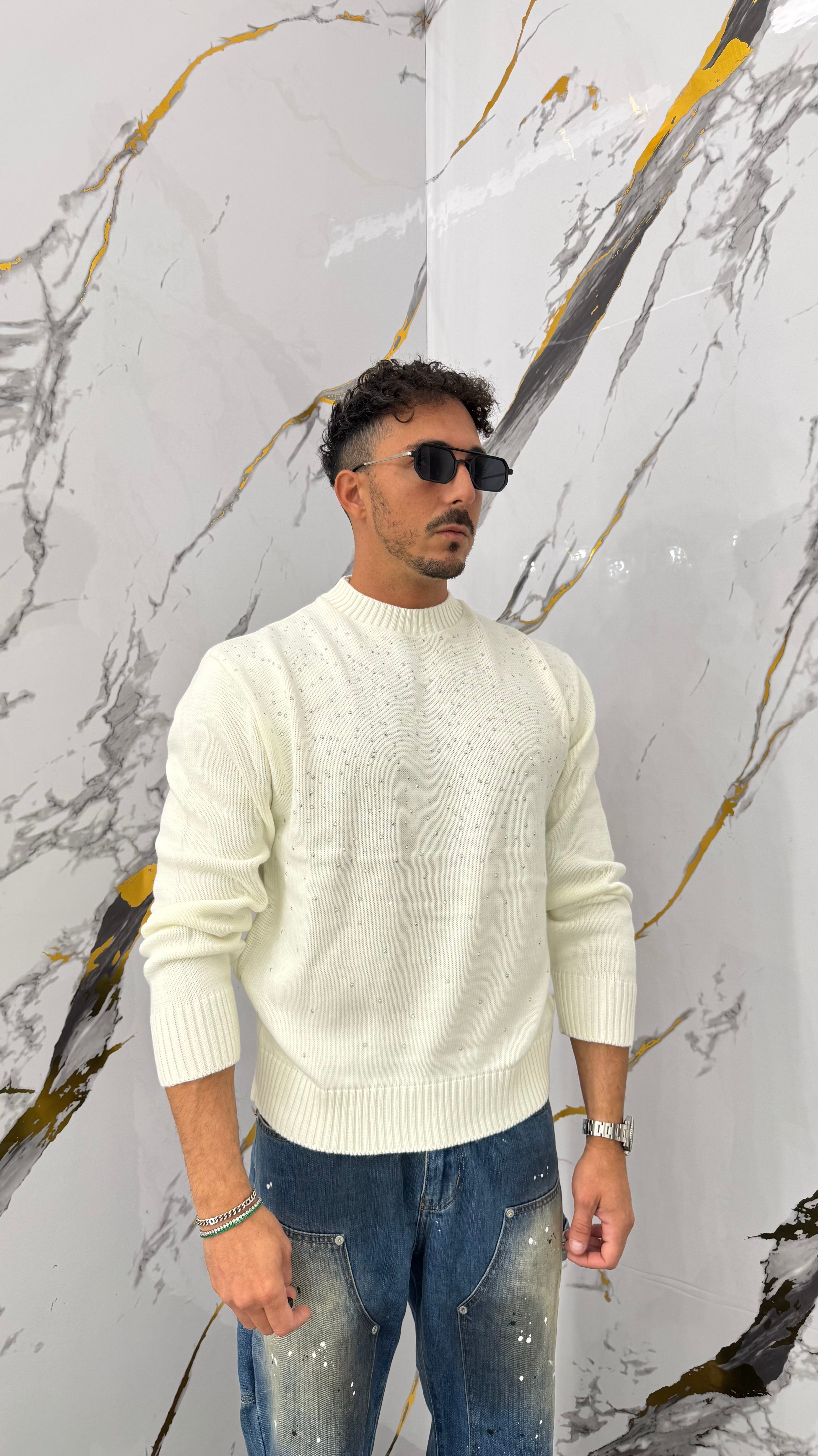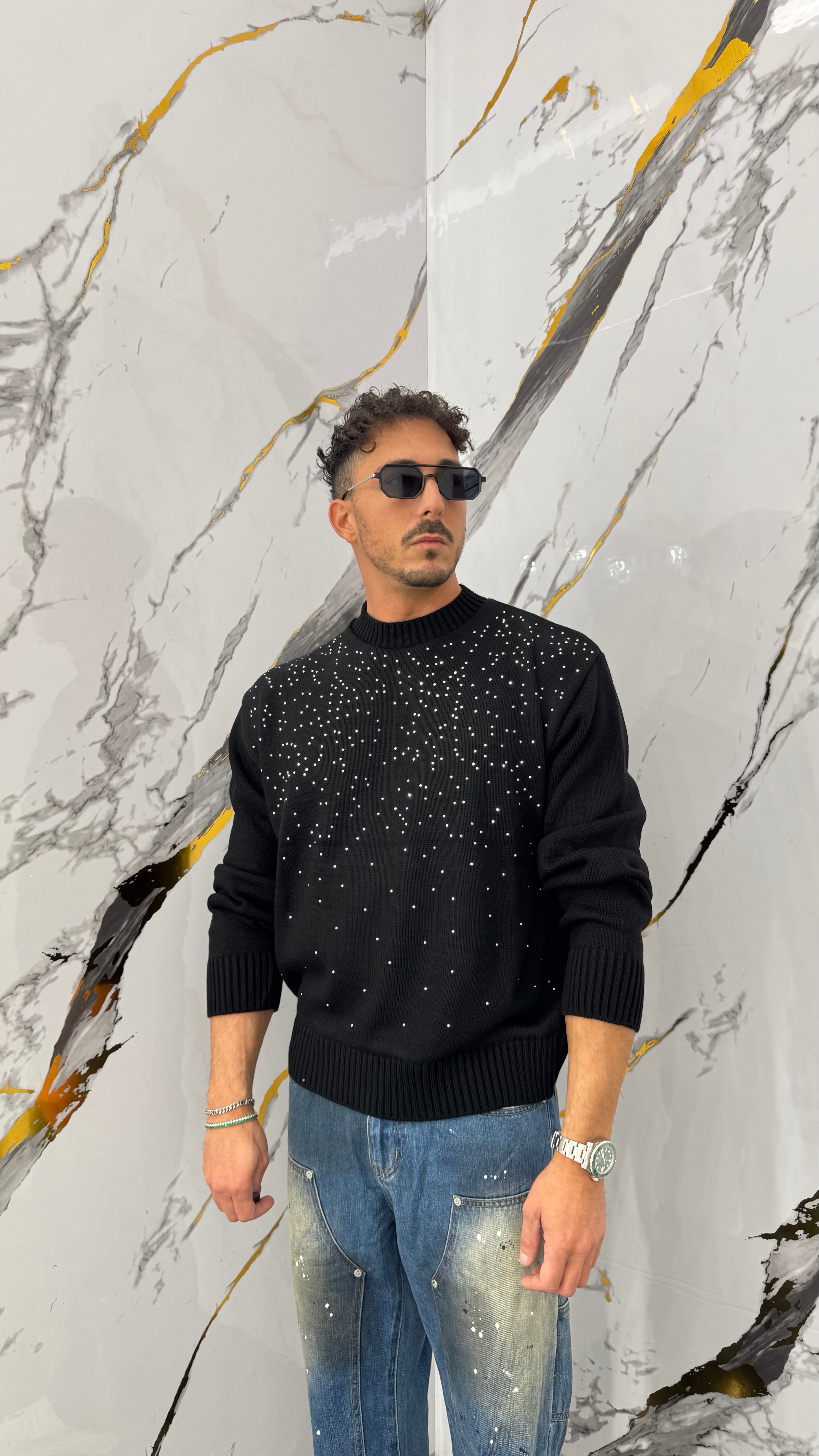 Maglia girocollo con brillantini a cascata dalle spalle, morbida e luminosa. Dona un effetto elegante ma easy da giorno o sera.