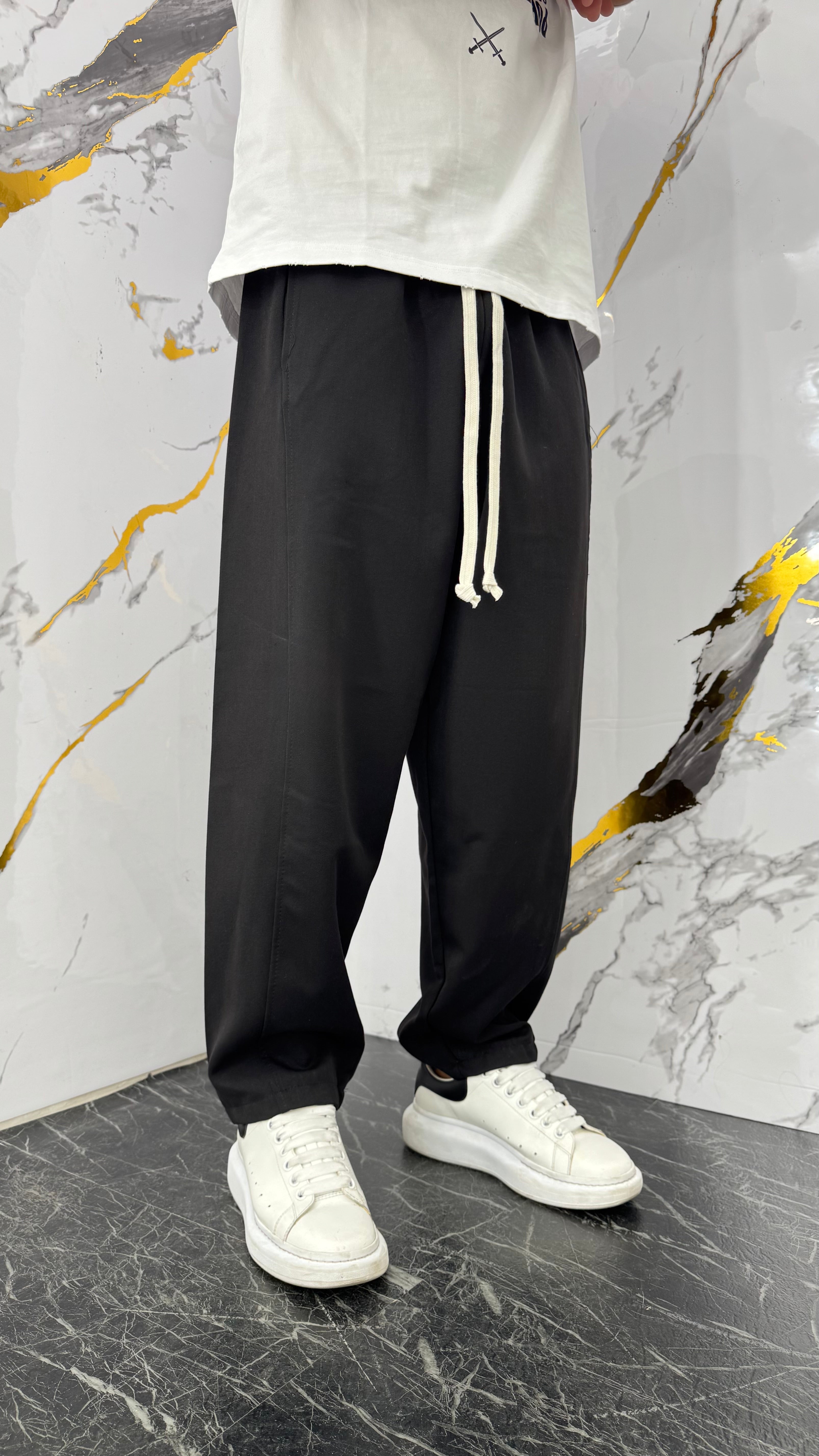 Pantalone japan con elastico in vita e laccioni