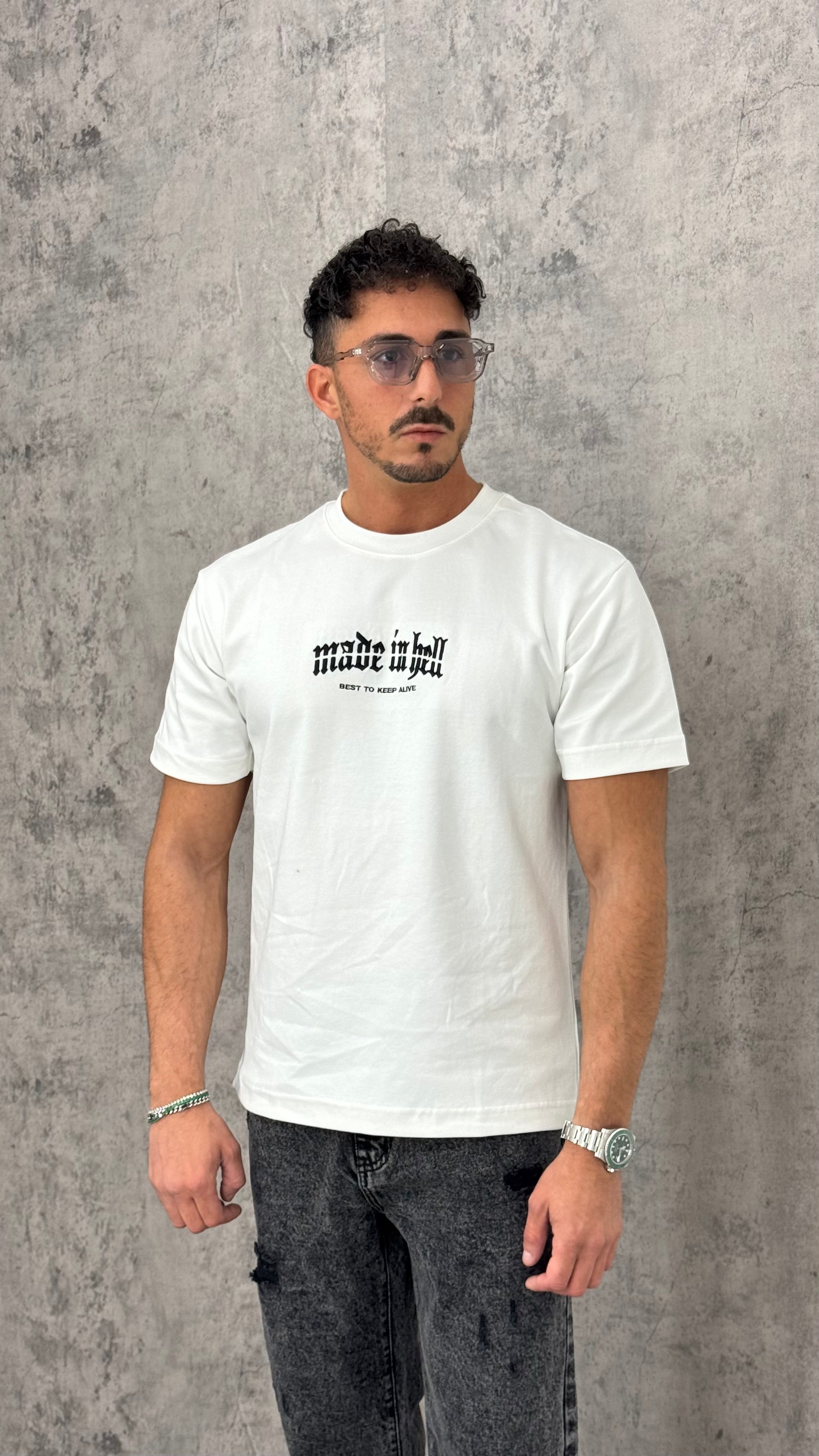 T-shirt con scritta cucita “Made in Hell” sul fronte e stampa coordinata sul retro. Look street deciso e grintoso, perfetto per outfit urban.