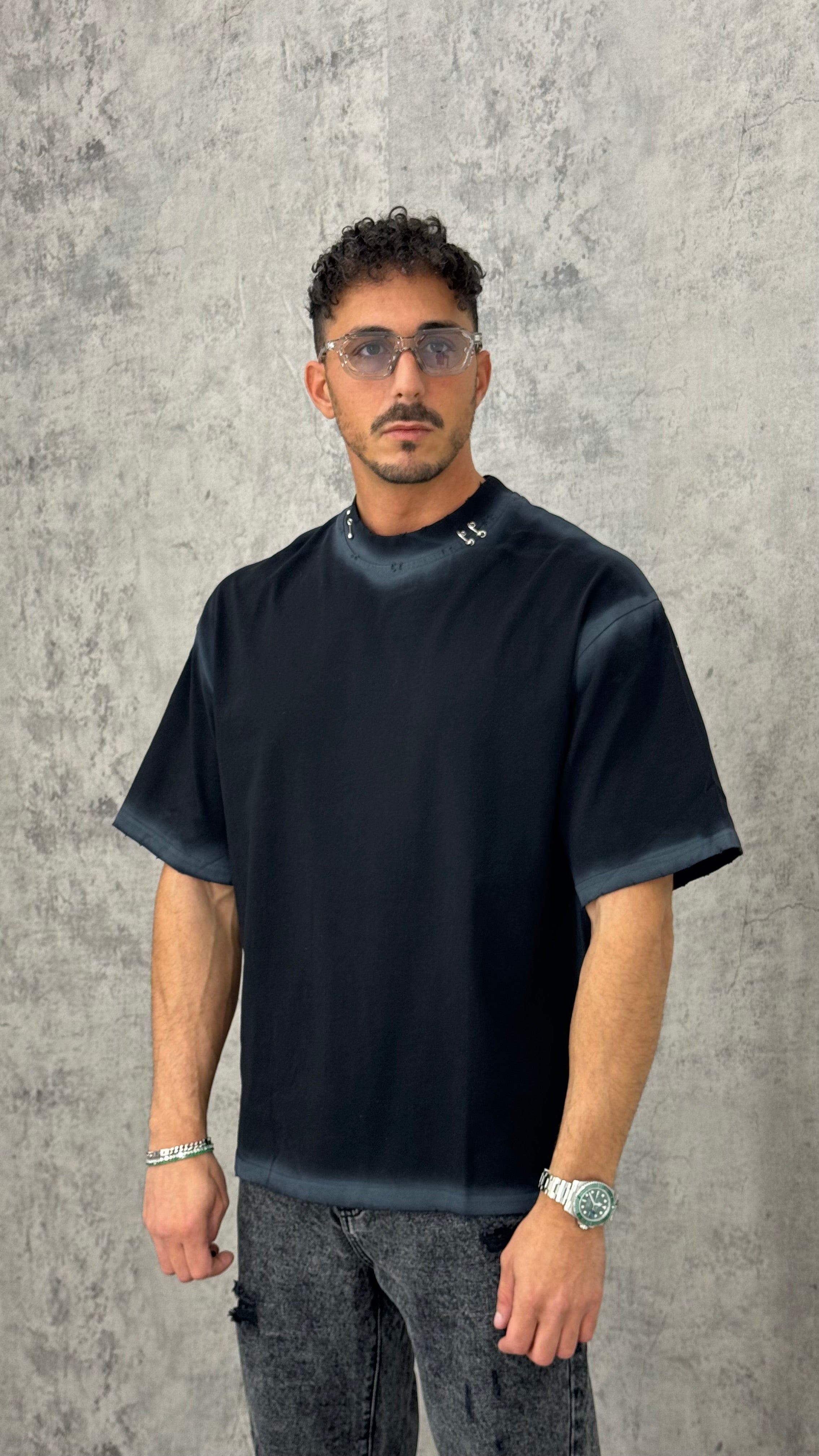 T-shirt con sfumature leggere e dettagli di piercing sul girocollo. Look street-chic originale, con un tocco edgy e moderno.